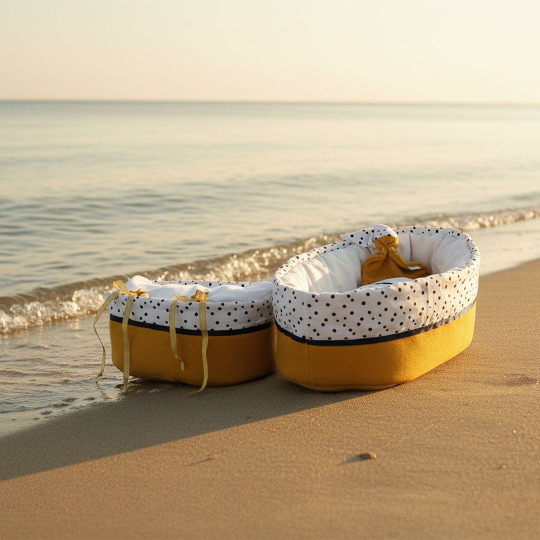 Het babynestje is met zorg gemaakt om een klein kindje een zachte, geborgen plek te bieden. De warme okergele fleece voelt knuffelig en troostend aan, terwijl de zwart-wit gestipte katoen een speels accent geeft. Langs de rand loopt een fijn zwart bandje dat het geheel een liefdevolle en rustige uitstraling geeft. Inclusief een klein poppetje van hetzelfde materiaal en een bijpassend kaarsje, een liefdevol gebaar van troost, licht en nabijheid.