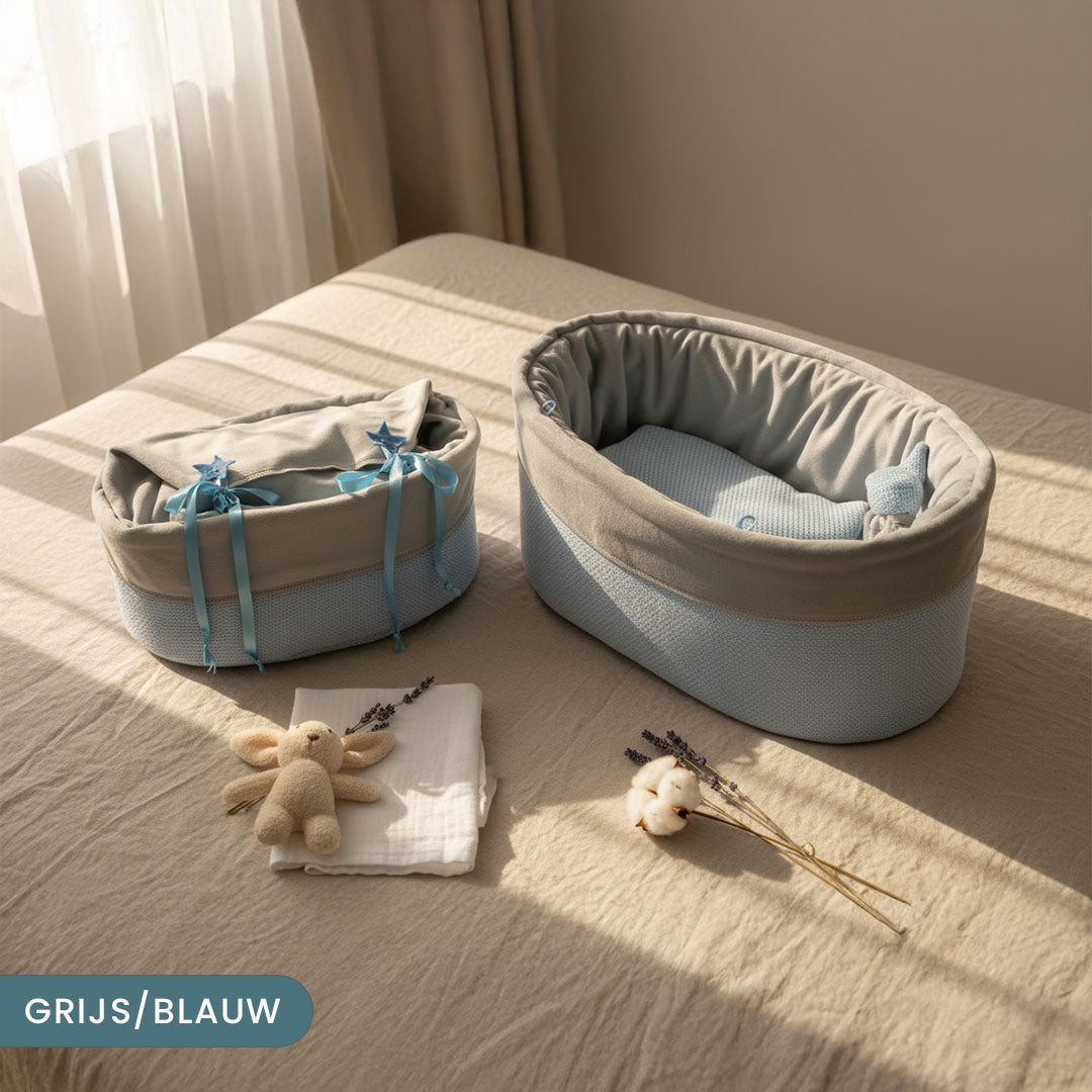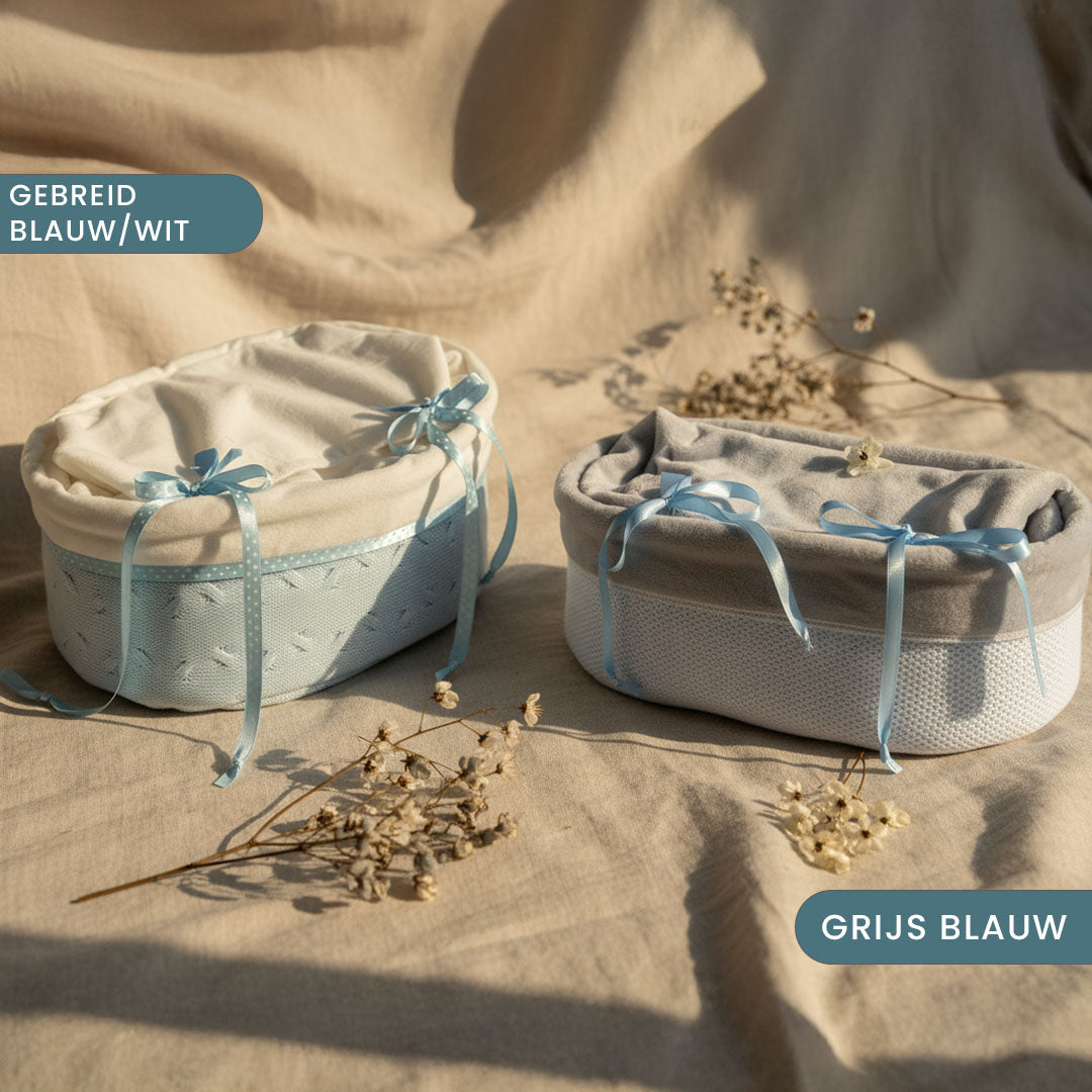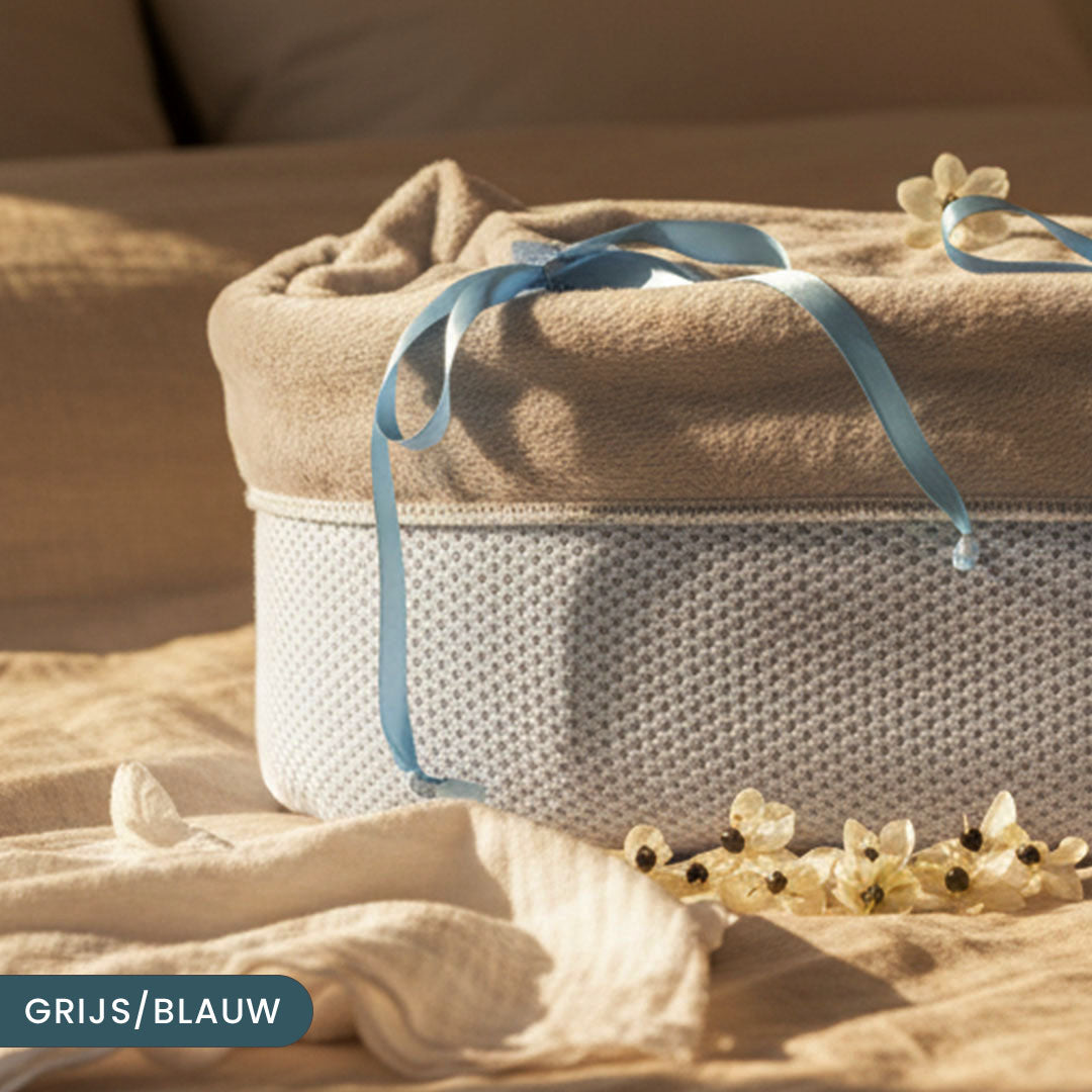 Het babynestje straalt rust en zachtheid uit. Vervaardigd uit fijn gebreide poederblauwe stof in combinatie met een superzachte grijze binnenzijde. De zachte texturen en kalme tinten zorgen samen voor een liefdevolle en veilige plek om afscheid te nemen. Inclusief een klein poppetje van hetzelfde materiaal en een bijpassend kaarsje, symbolen van troost, liefde en licht. Een troostvol aandenken om te bewaren of met het kindje mee te geven.
