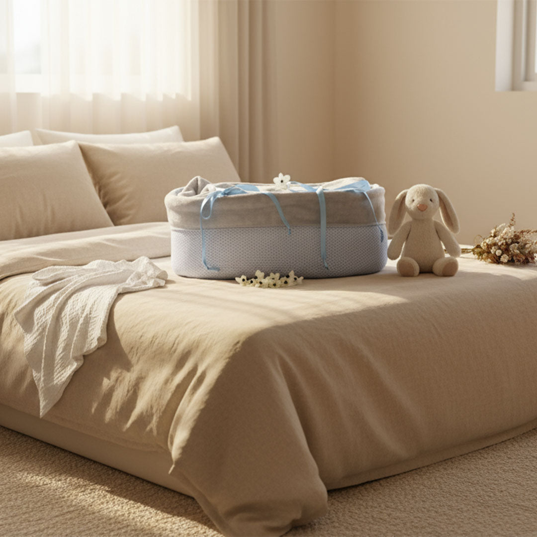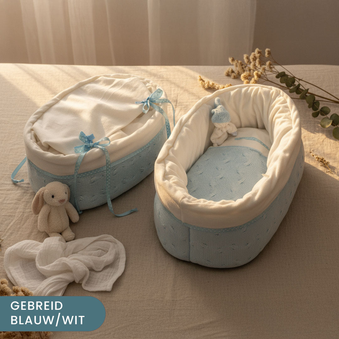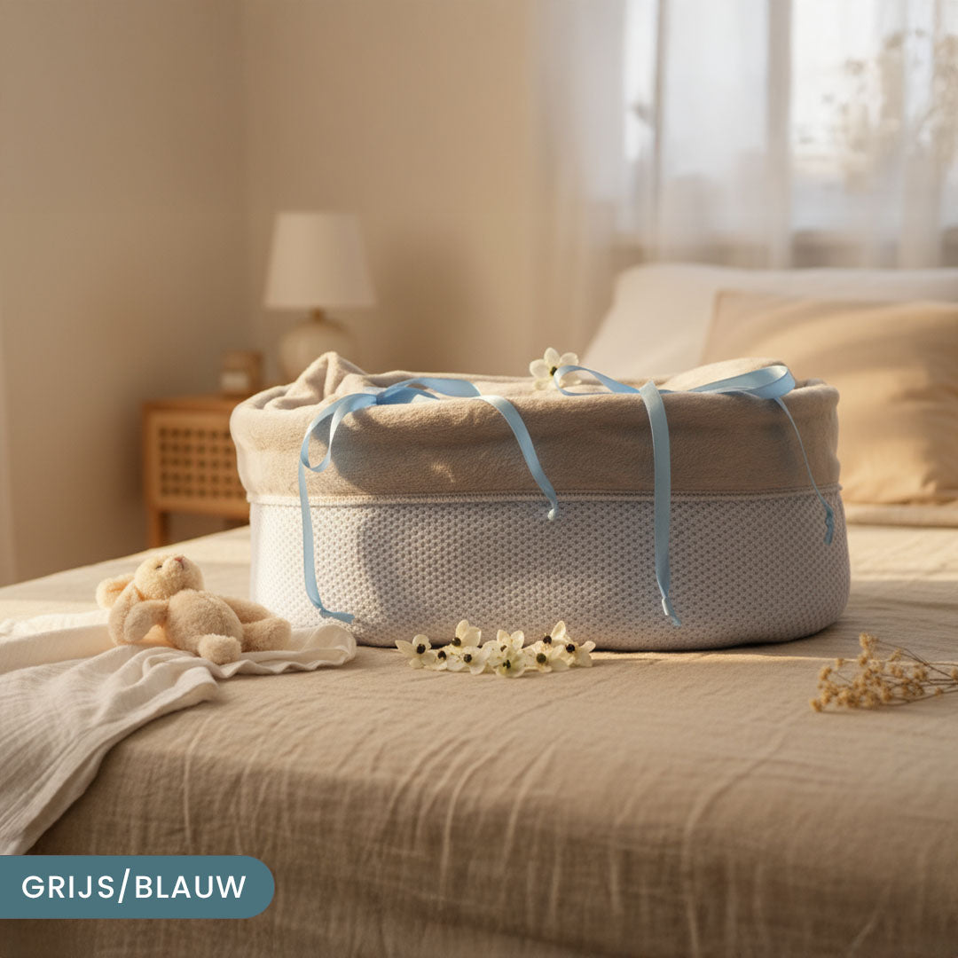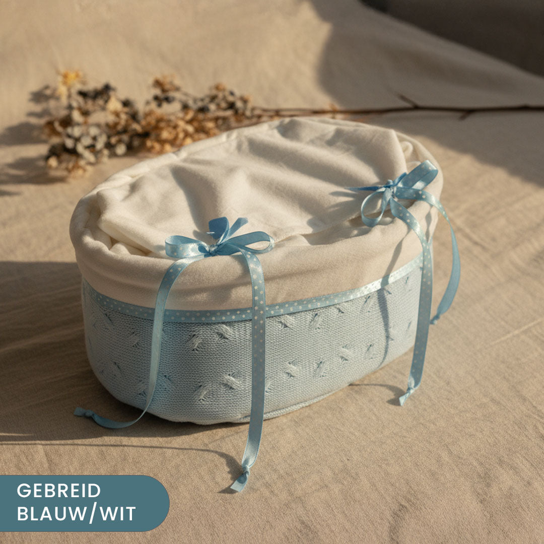 Het babynestje straalt rust en zachtheid uit. Vervaardigd uit fijn gebreide poederblauwe stof in combinatie met een superzachte grijze binnenzijde. De zachte texturen en kalme tinten zorgen samen voor een liefdevolle en veilige plek om afscheid te nemen. Inclusief een klein poppetje van hetzelfde materiaal en een bijpassend kaarsje, symbolen van troost, liefde en licht. Een troostvol aandenken om te bewaren of met het kindje mee te geven.