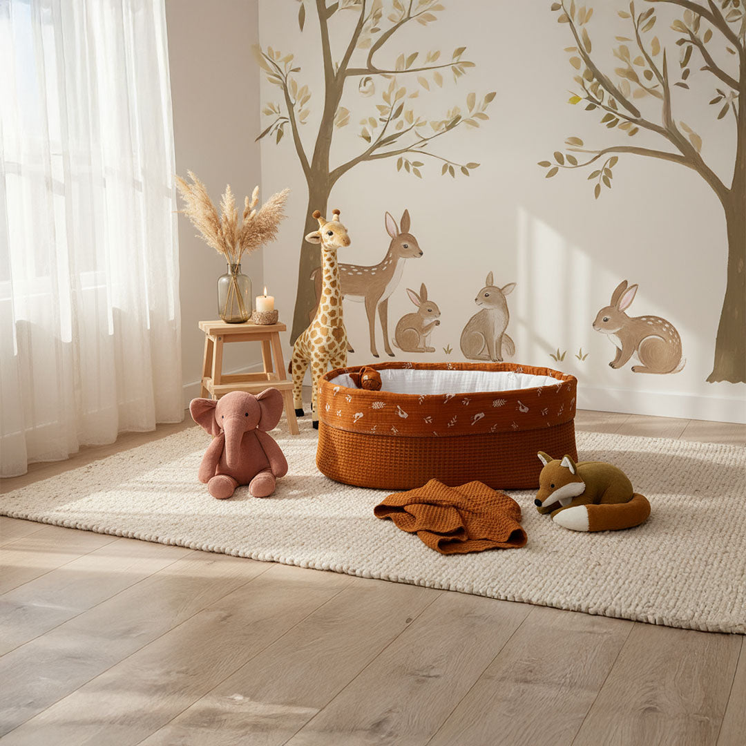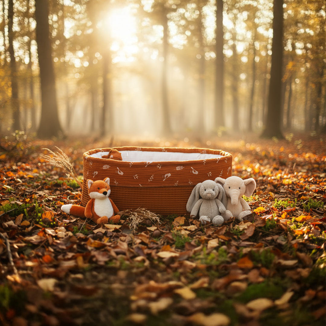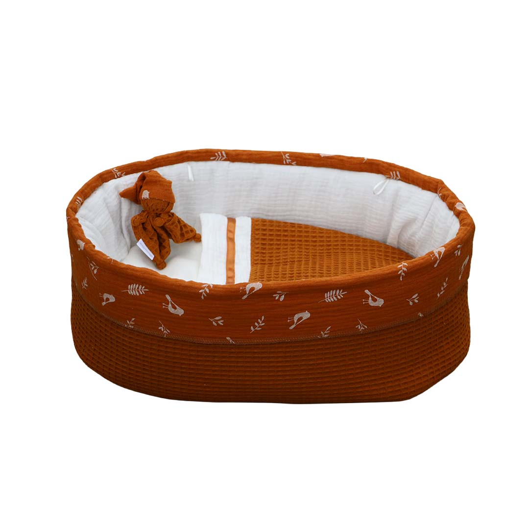 Het babynestje Sweet Dreams omarmt warmte en zachtheid. Gemaakt van roestkleurige wafelstof met een hydrofiel randje vol vogeltjes en takjes, een knipoog naar de natuur. Het dekentje van bijpassende wafelstof is afgewerkt met een subtiel satijnbandje, wat een vleugje verfijning geeft. Het nestje sluit met satijnen lintjes met een klein vilten sterretje, als liefdevol detail. Elk nestje wordt geleverd met een bijpassend poppetje van hetzelfde materiaal, een troostvolle herinnering om te bewaren of met het kindje mee te geven. Als symbolisch gebaar van licht en liefde is er een klein kaarsje toegevoegd. Een zacht vlammetje dat herinnert aan het warme gevoel van nabijheid, een lichtje voor altijd.