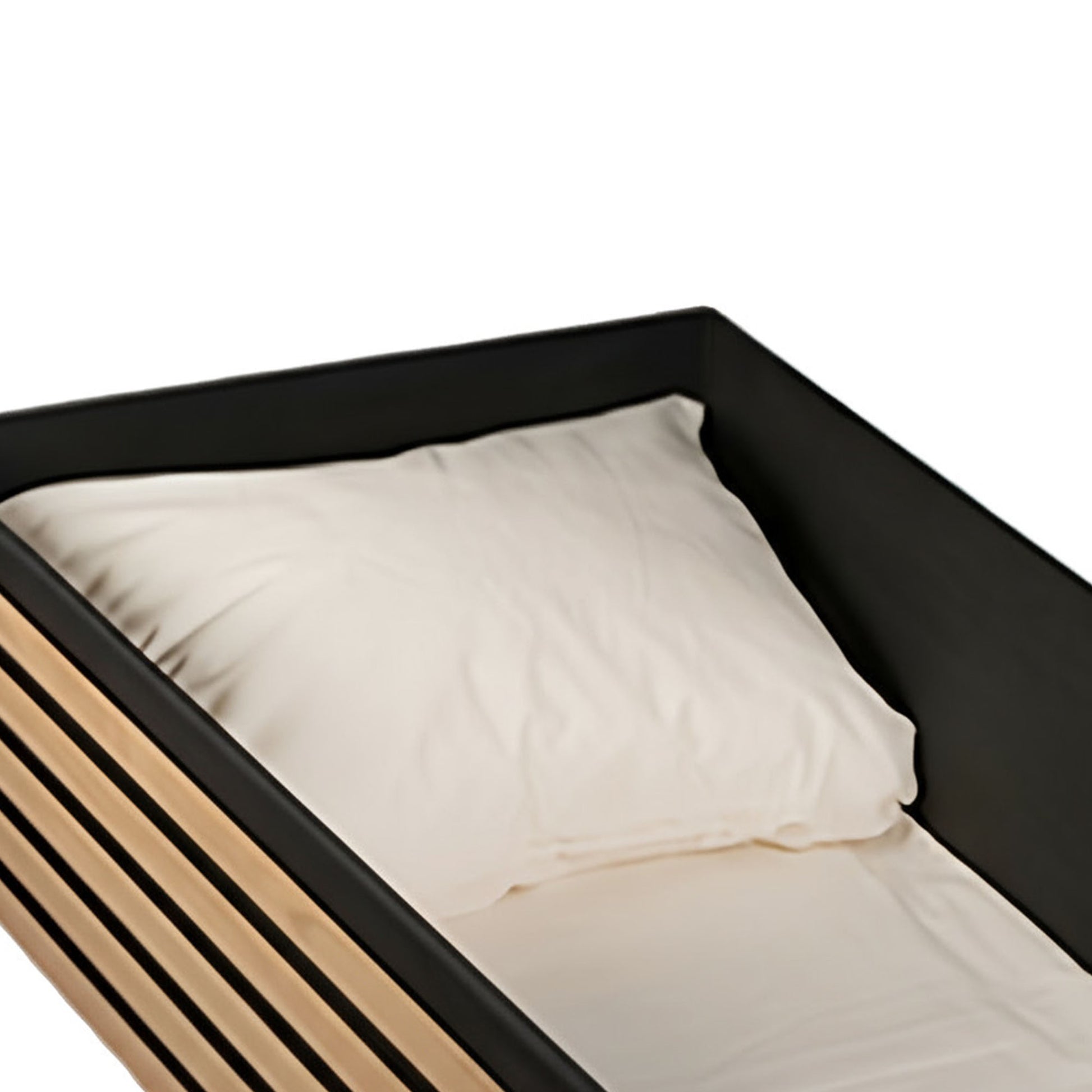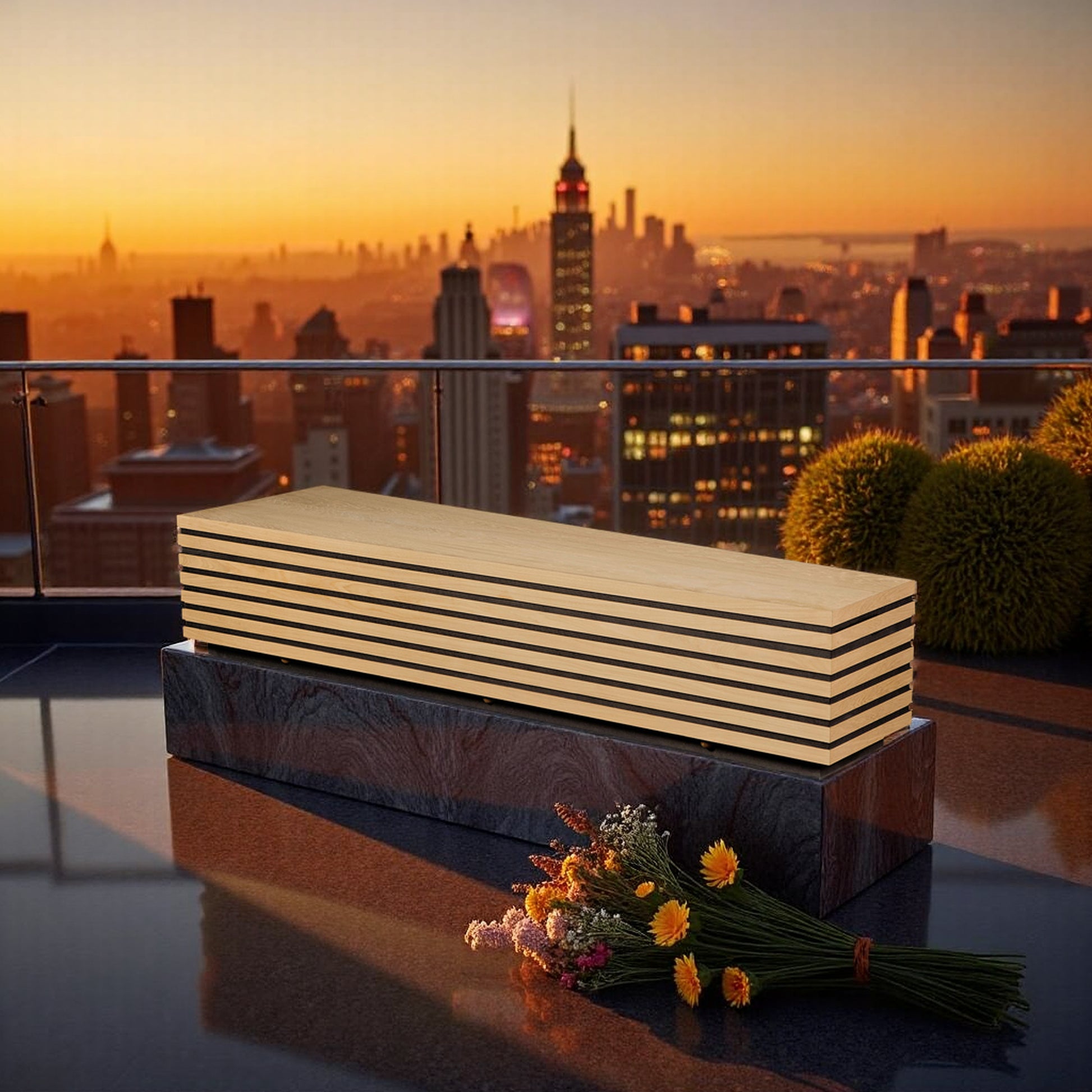Deze uitvaartkist van hoogwaardig MDF ademt rust en moderniteit. De strakke horizontale lijnen en naadloze afwerking geven een tijdloze, verfijnde uitstraling, terwijl het zachte katoenen interieur een gevoel van geborgenheid biedt. Omgeven door het gouden licht van de ondergaande zon is deze kist ontworpen voor een sereen en stijlvol afscheid, minimalistisch, warm en vol betekenis.
