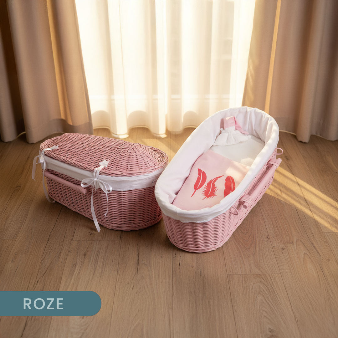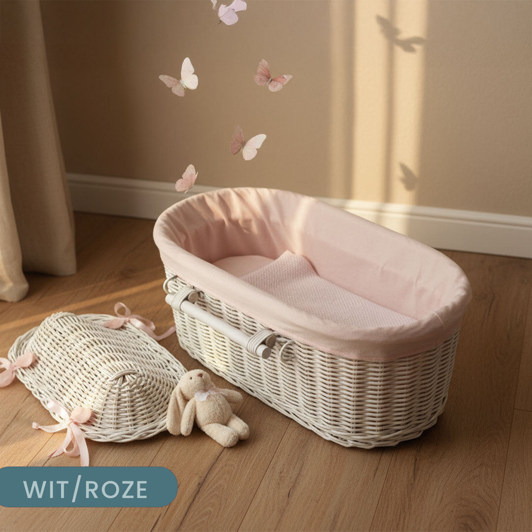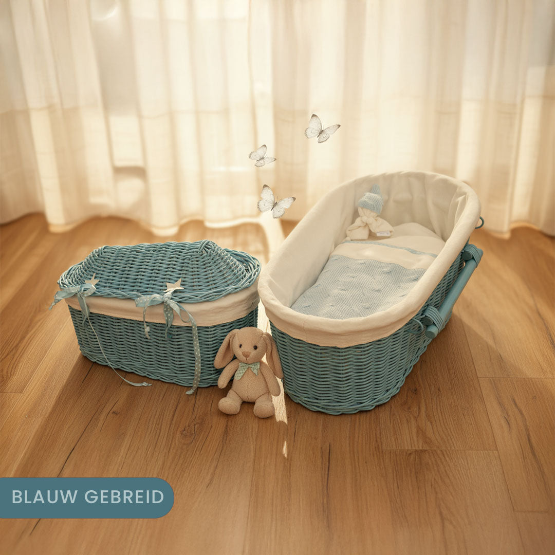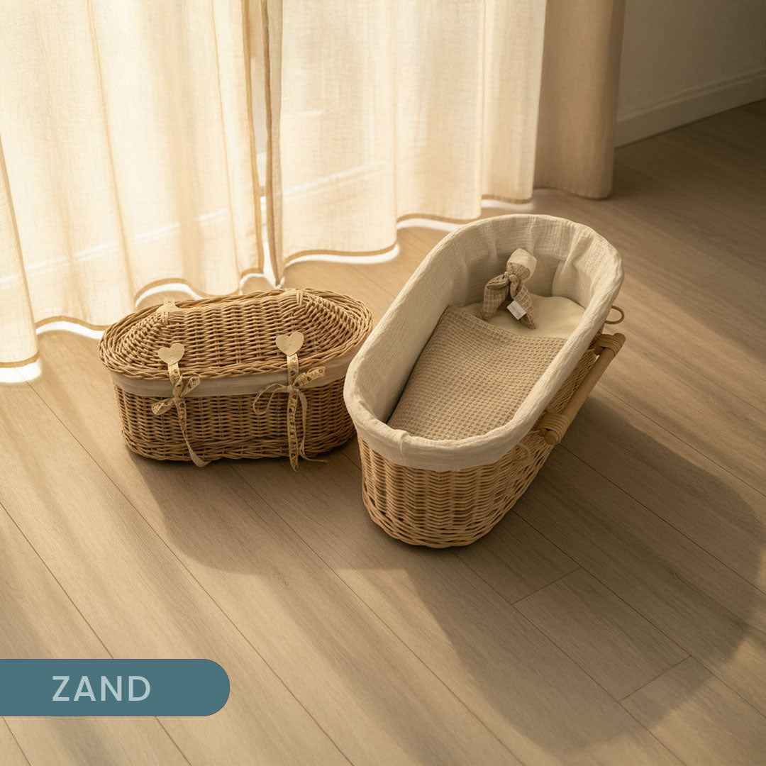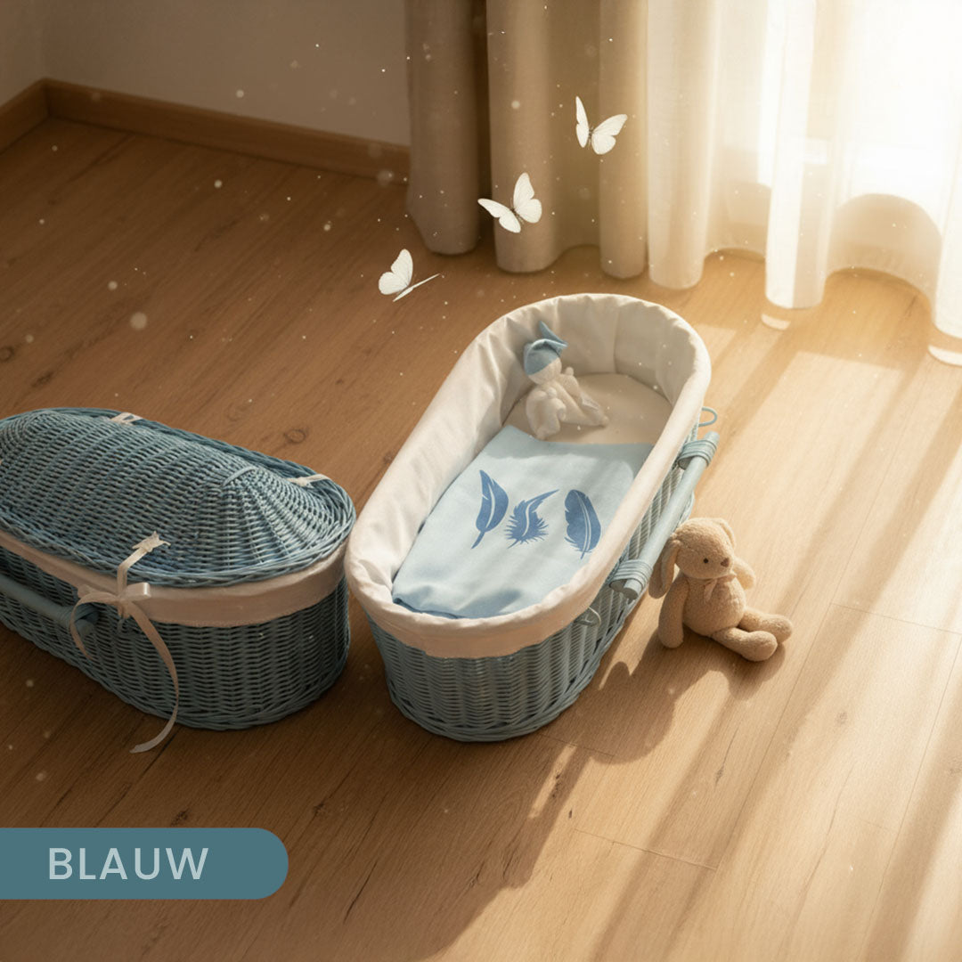 Elk mandje is voorzien van een zachte binnenrand, een matrasje en een bijpassend dekentje, zorgvuldig afgestemd voor een vredig en geborgen geheel. Inclusief een klein poppetje van hetzelfde materiaal en een bijpassend kaarsje, symbolen van liefde, licht en verbondenheid.