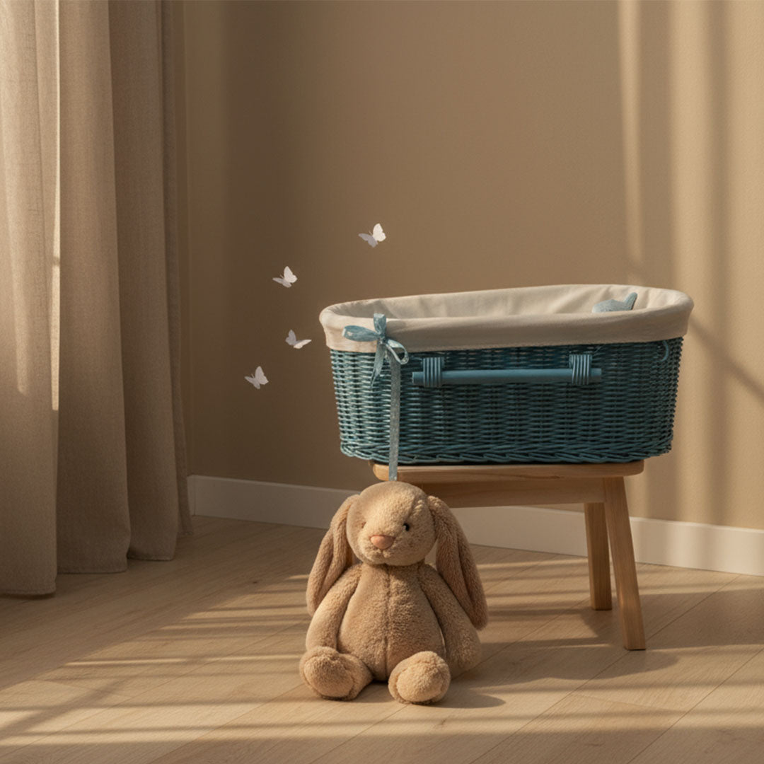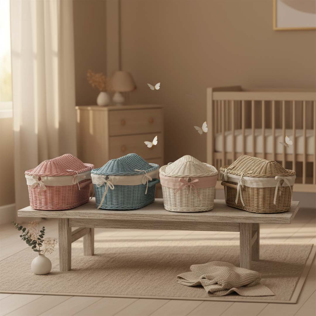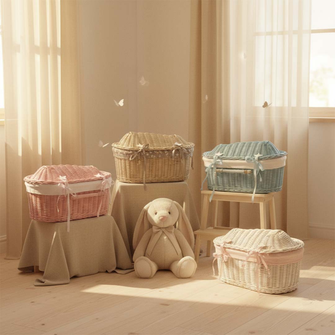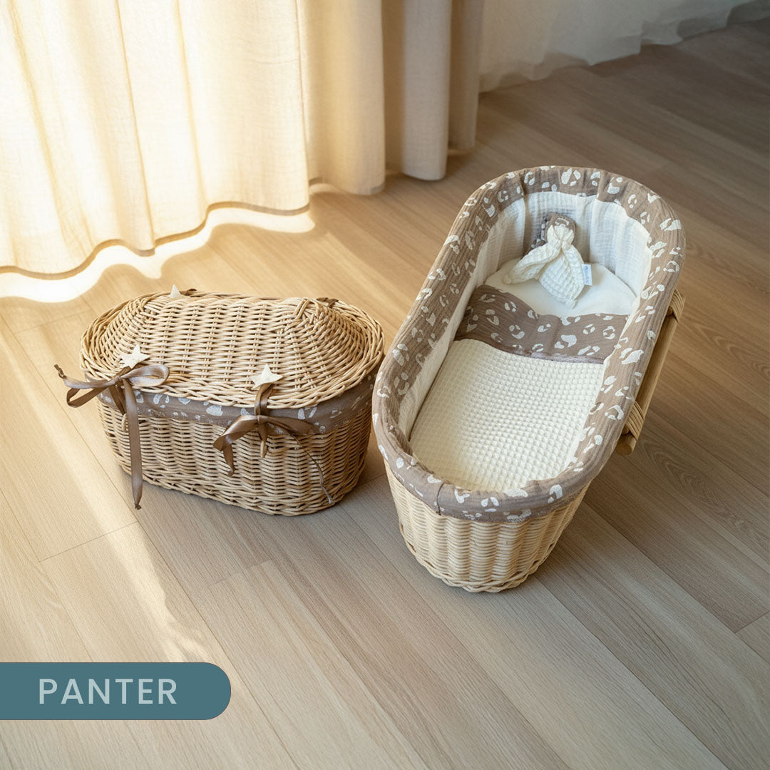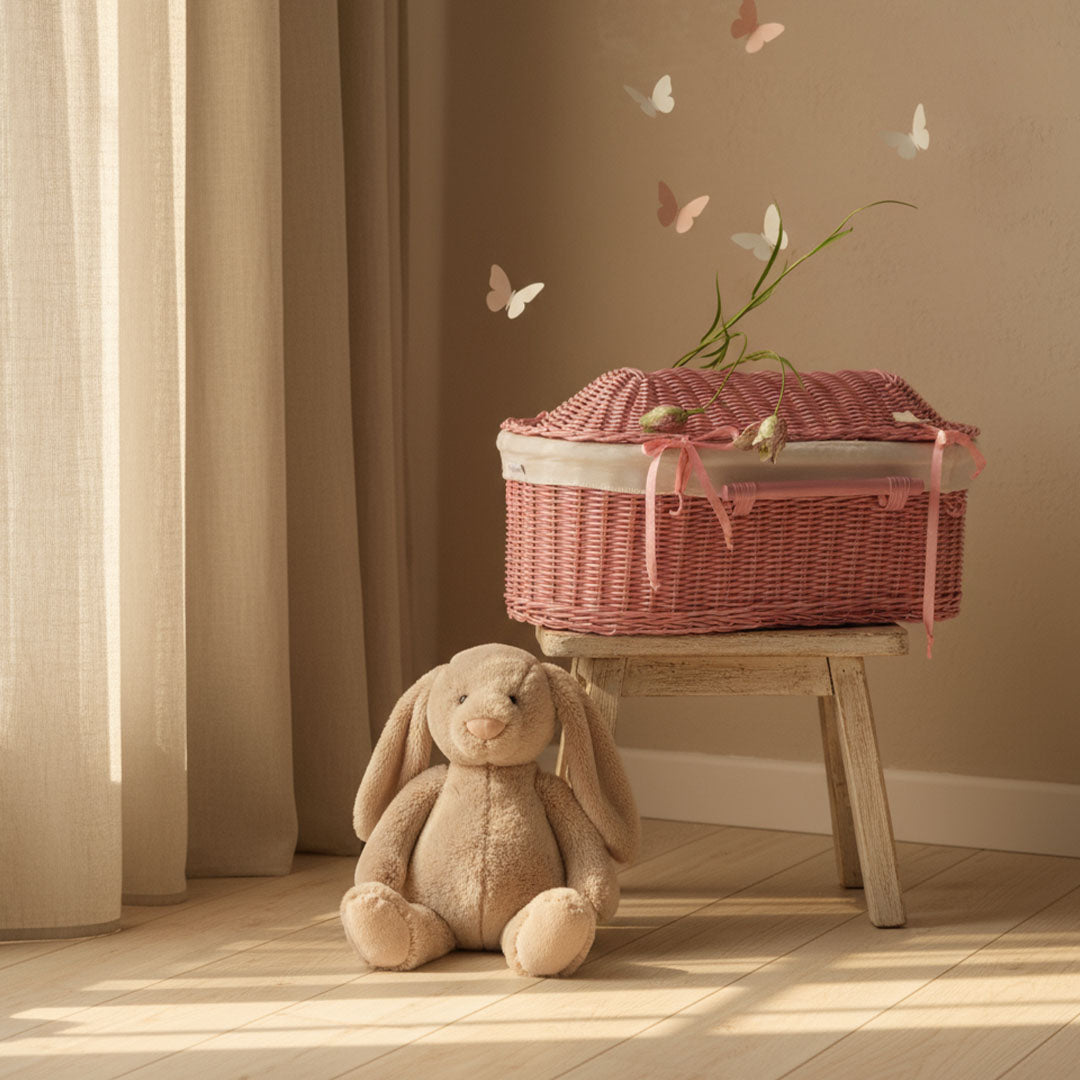 Elk mandje is voorzien van een zachte binnenrand, een matrasje en een bijpassend dekentje, zorgvuldig afgestemd voor een vredig en geborgen geheel. Inclusief een klein poppetje van hetzelfde materiaal en een bijpassend kaarsje, symbolen van liefde, licht en verbondenheid.