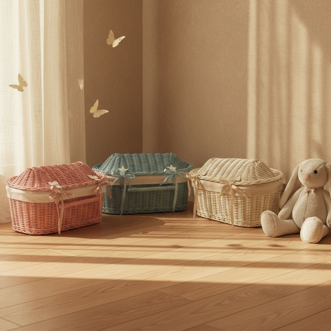De deksel sluit met gekleurde satijnen lintjes, afgewerkt met een klein sterretje of hartje, als teder detail dat het geheel compleet maakt.