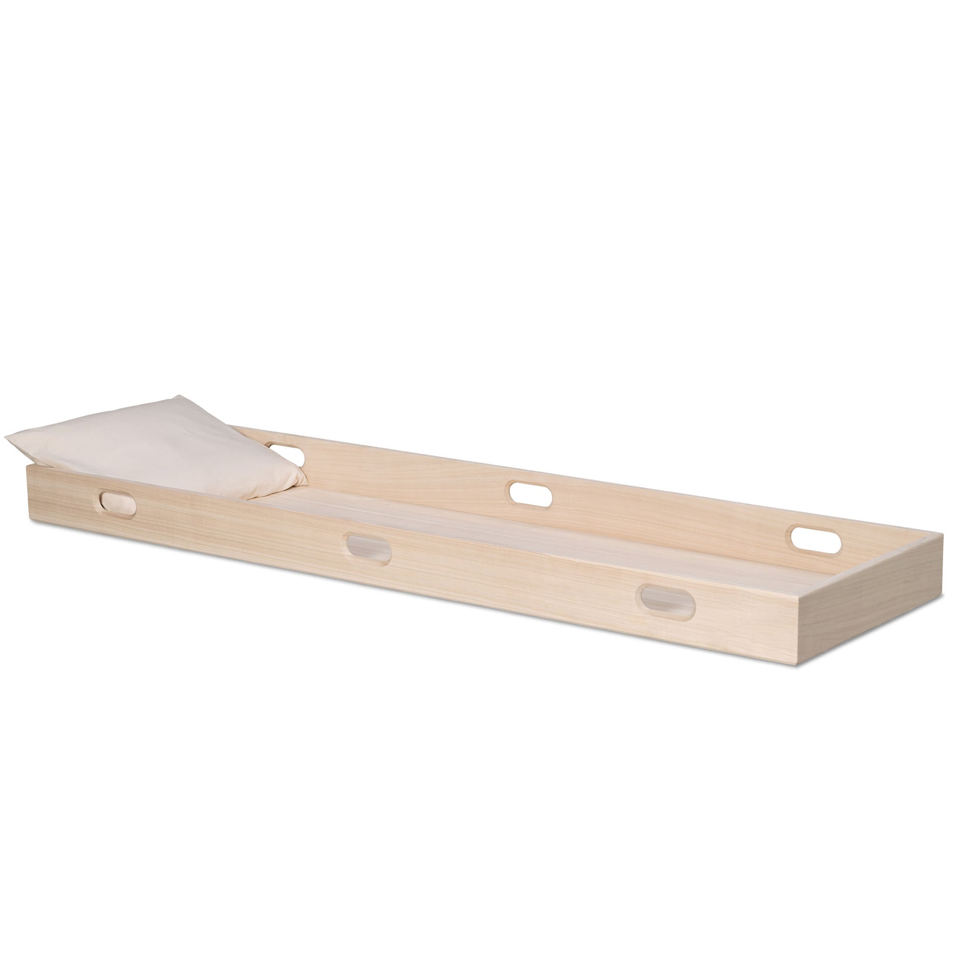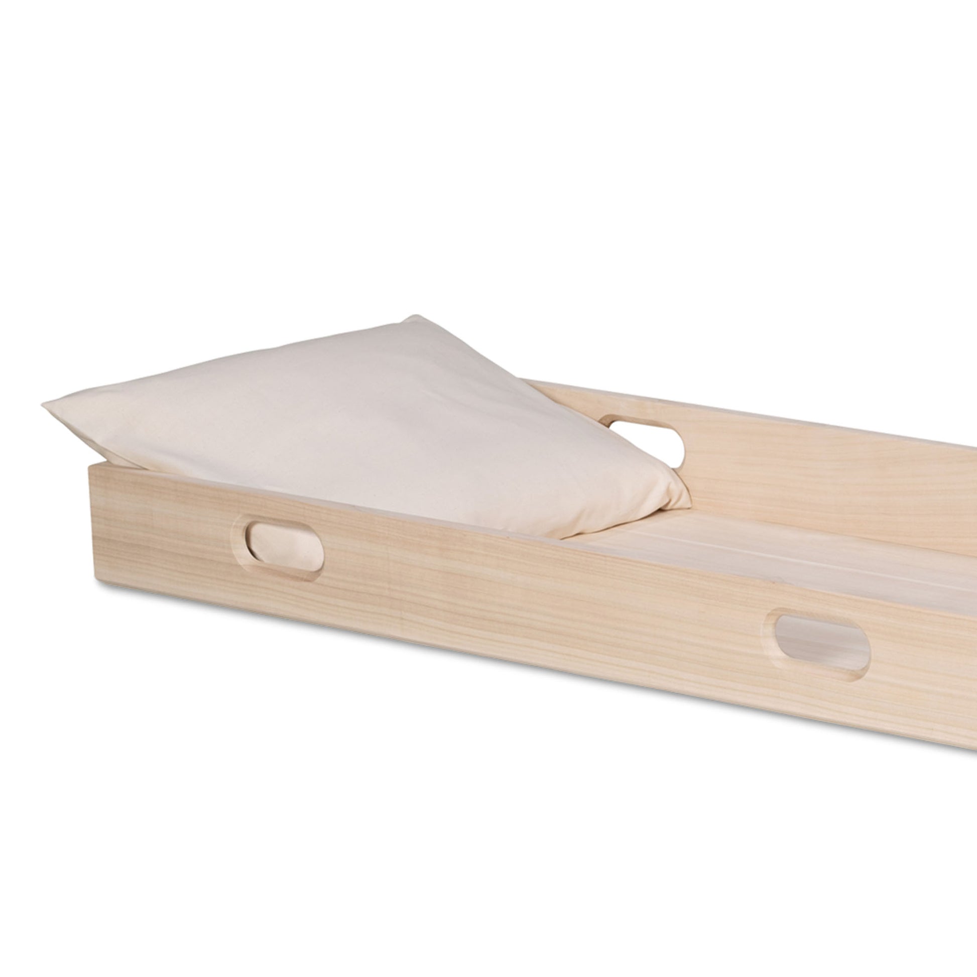 De opbaarplank Drifting Home is een ingetogen opbaarplank van licht populierenhout met een fijn geschuurde afwerking. De warme houttinten en subtiele nerf stralen rust en zachtheid uit, terwijl het strak beklede katoenen oppervlak met zacht dekentje een troostrijke aanblik biedt. Geïntegreerde handgrepen maken een respectvolle verplaatsing mogelijk, zonder de pure eenvoud te doorbreken — een natuurlijke keuze voor een waardig afscheid.