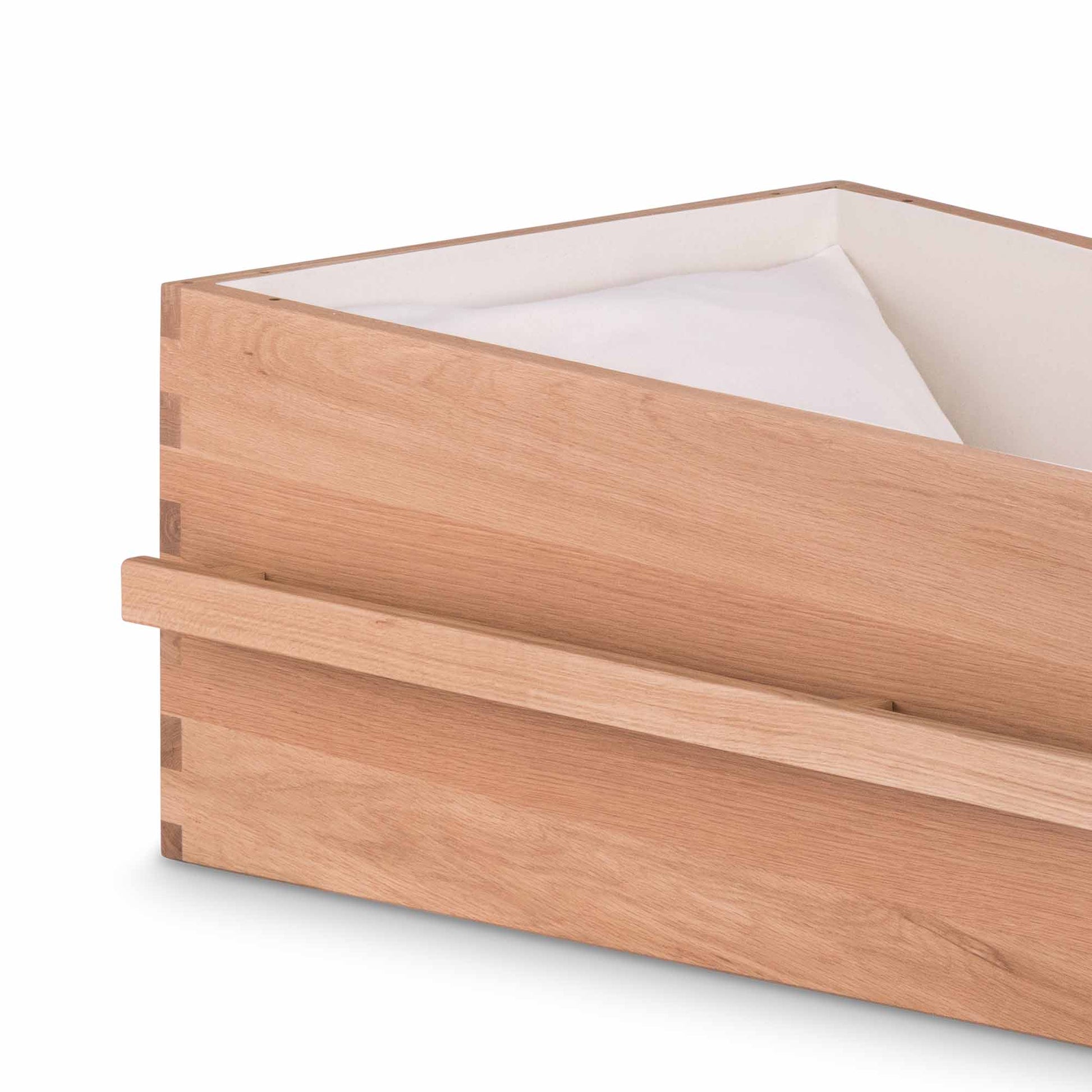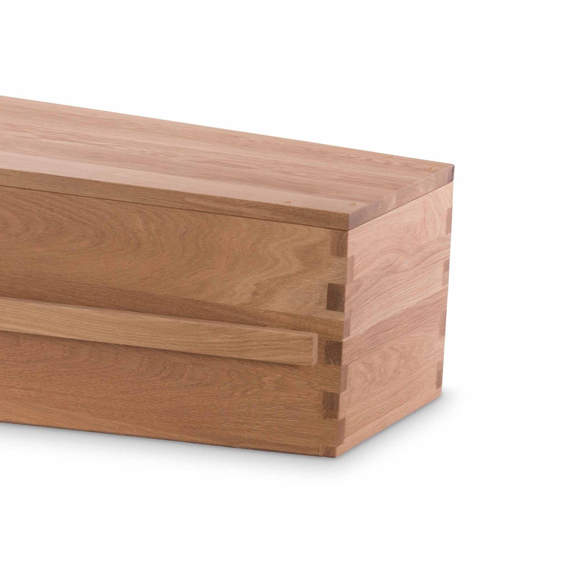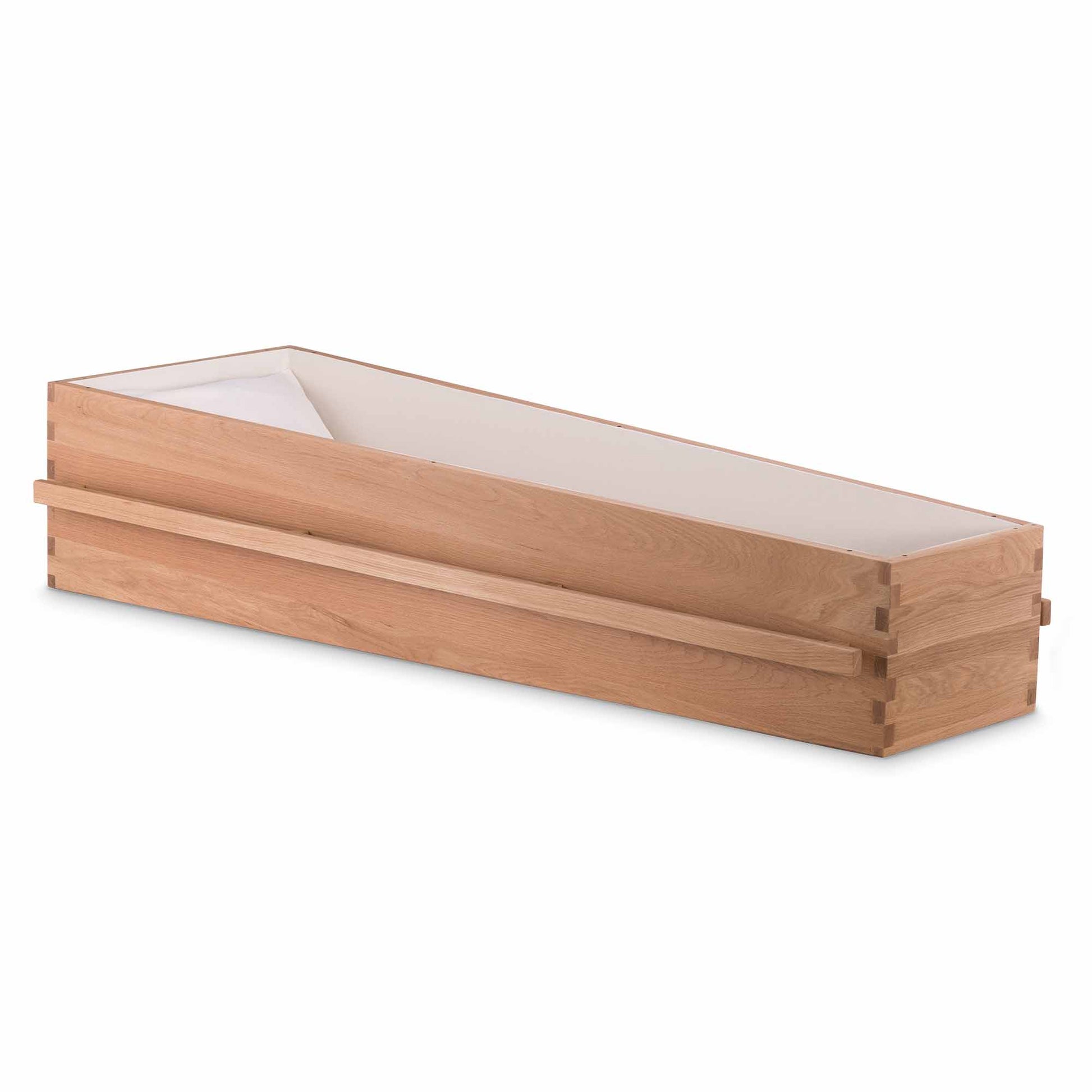 Omgeven door zacht ochtendlicht en kabbelend water straalt de uitvaartkist Blush of Love rust, liefde en verfijning uit. Gemaakt van licht eikenhout en met zorg afgewerkt, vormt deze kist een stijlvol eerbetoon aan een zacht afscheid. De lange houten handgreep benadrukt de eenvoud van het ontwerp — ingetogen, natuurlijk en warm.