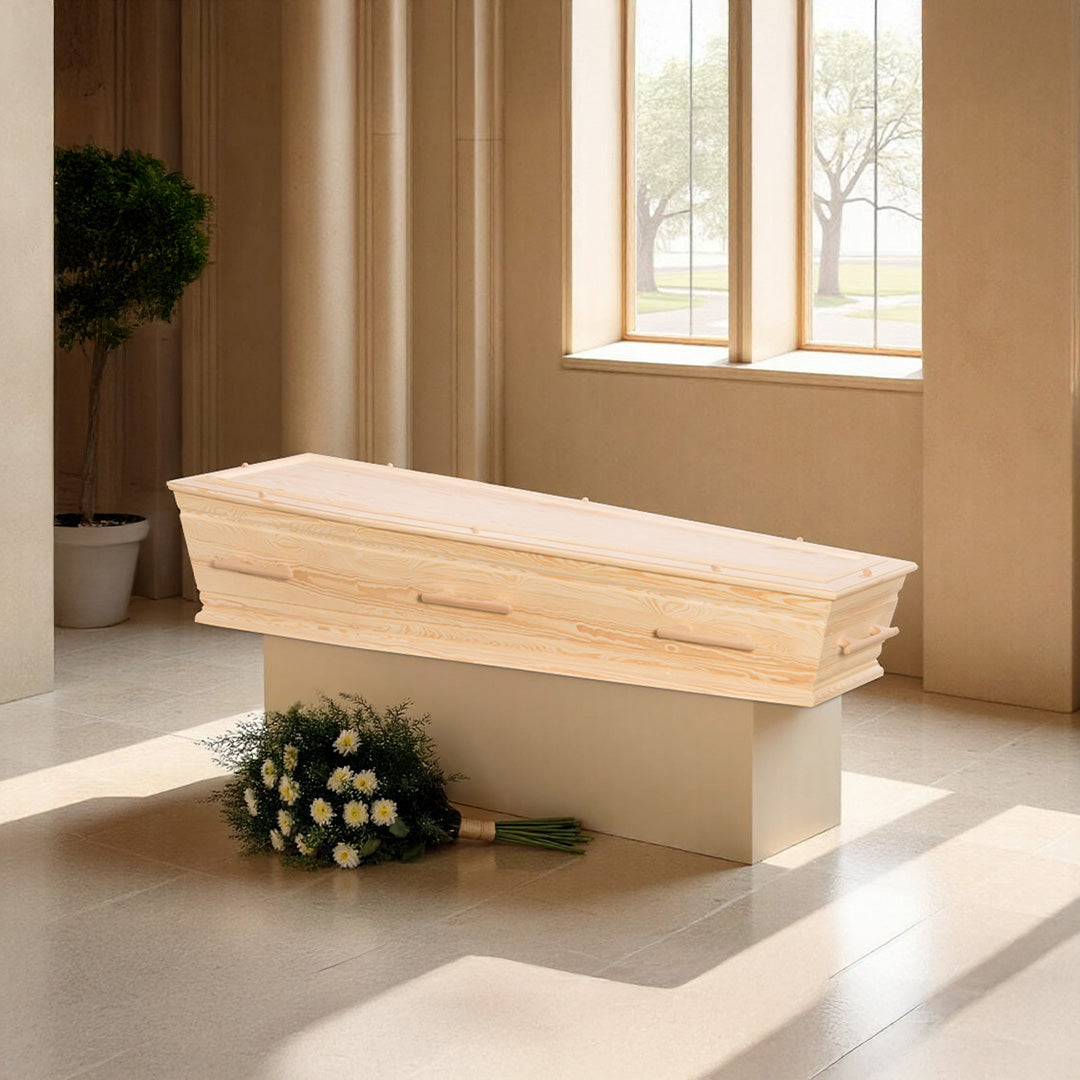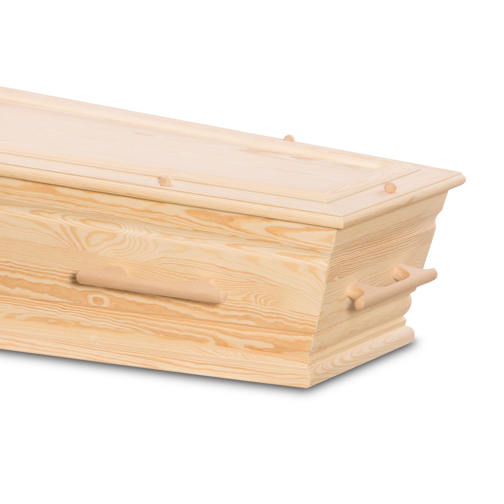 Verfijnd grenenhout, glad geschuurd en licht van tint, geeft de Eternal Kiss een elegante en klassieke uitstraling. De subtiele houtnerf en zachte glans benadrukken de tijdloze schoonheid. Binnenin biedt strak katoen met een zacht dekentje een serene rustplaats — een waardig en liefdevol afscheid in klassieke stijl.