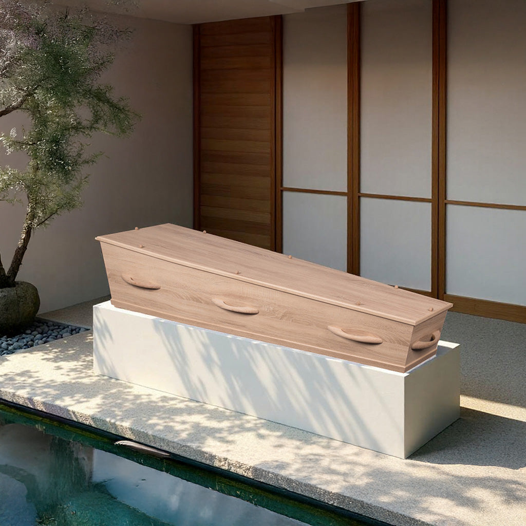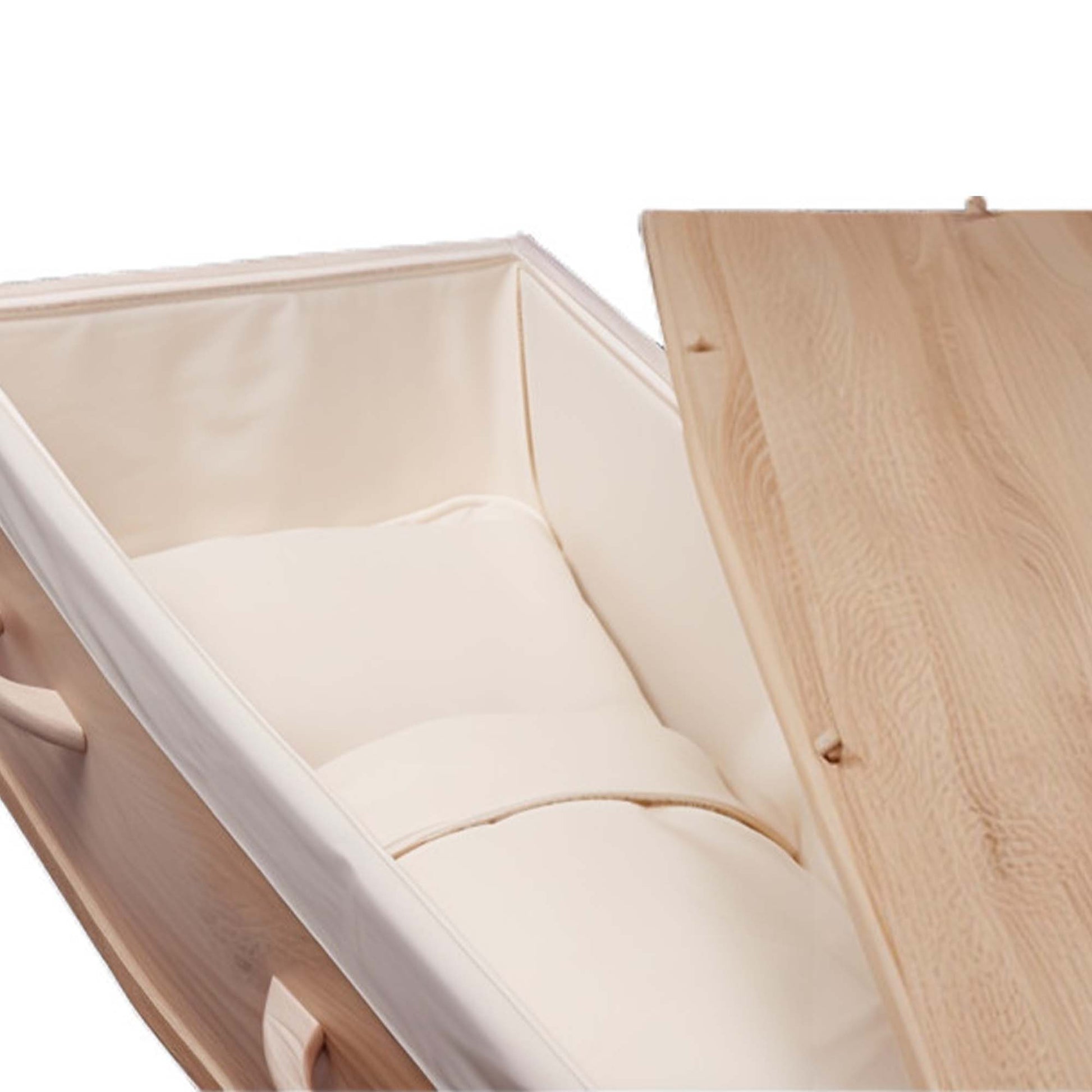 Omringd door zacht licht en serene eenvoud weerspiegelt de Flaxia de rust van de natuur. Deze duurzame uitvaartkist is gemaakt van vlas, een sterk en volledig natuurlijk materiaal.