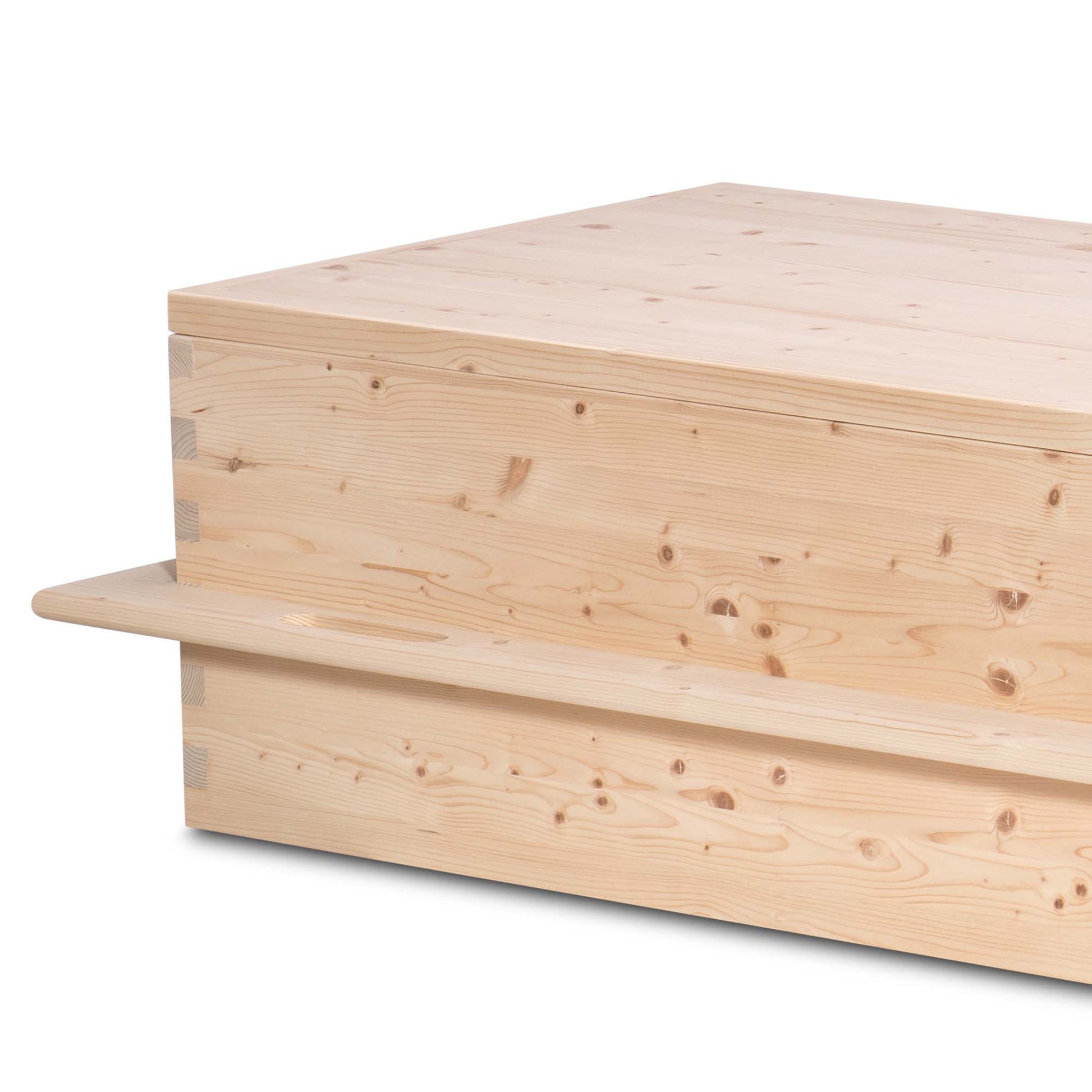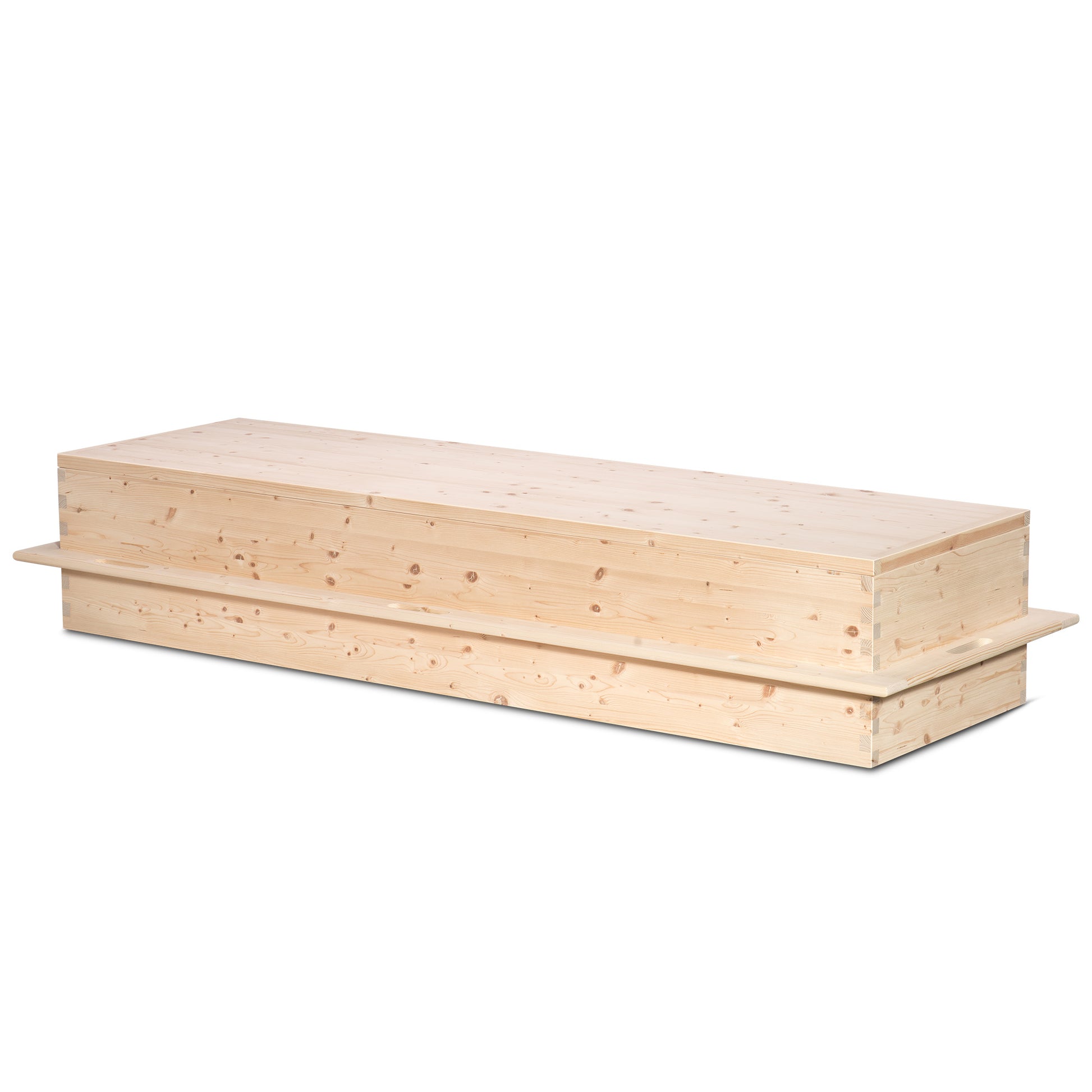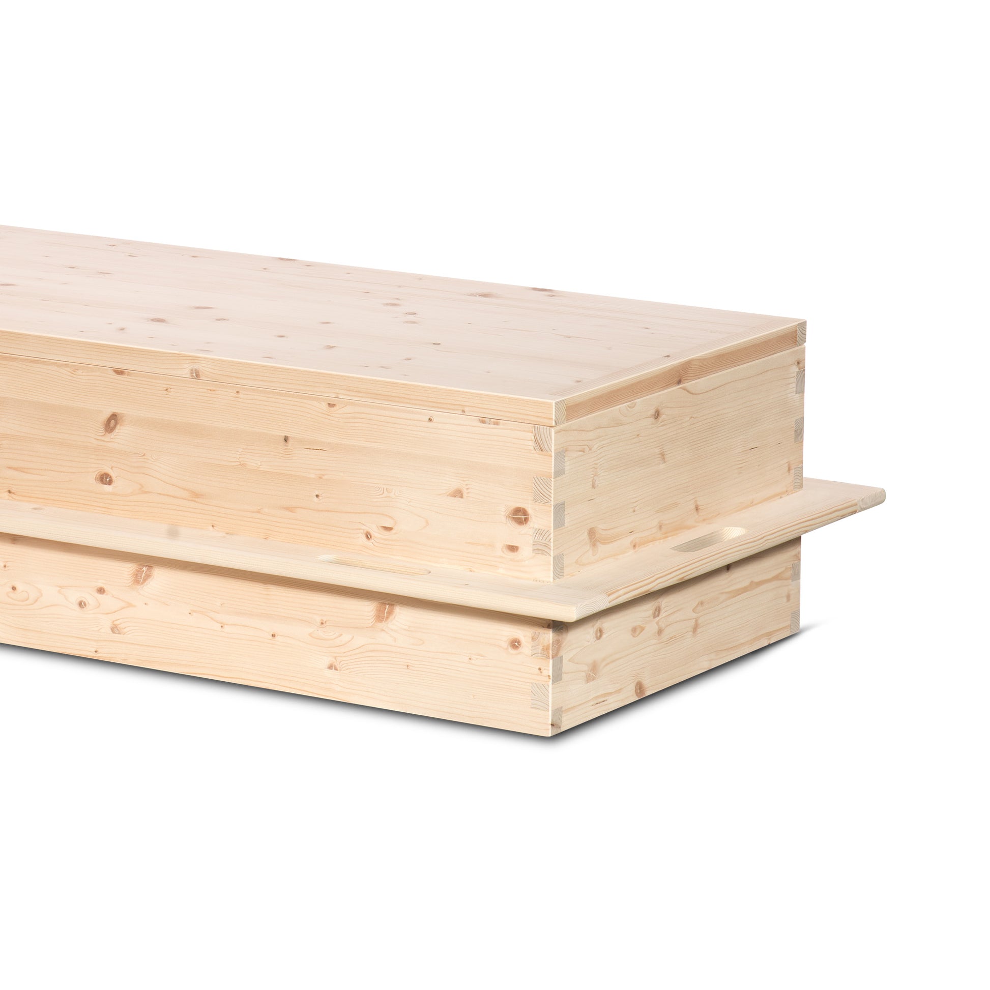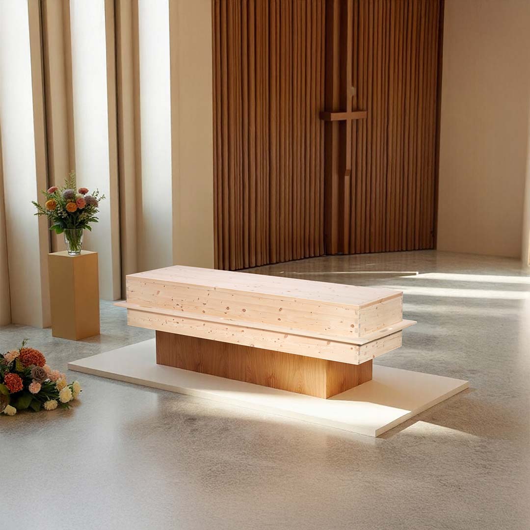 Omgeven door zacht invallend daglicht straalt de uitvaartkist Goodbye rust en eenvoud uit. Vervaardigd uit licht vurenhout met een gladde, natuurlijke afwerking vormt deze kist een ingetogen en liefdevol eerbetoon. Het strak katoenen interieur met zacht dekentje maakt de rustplaats compleet — warm, troostrijk en waardig.