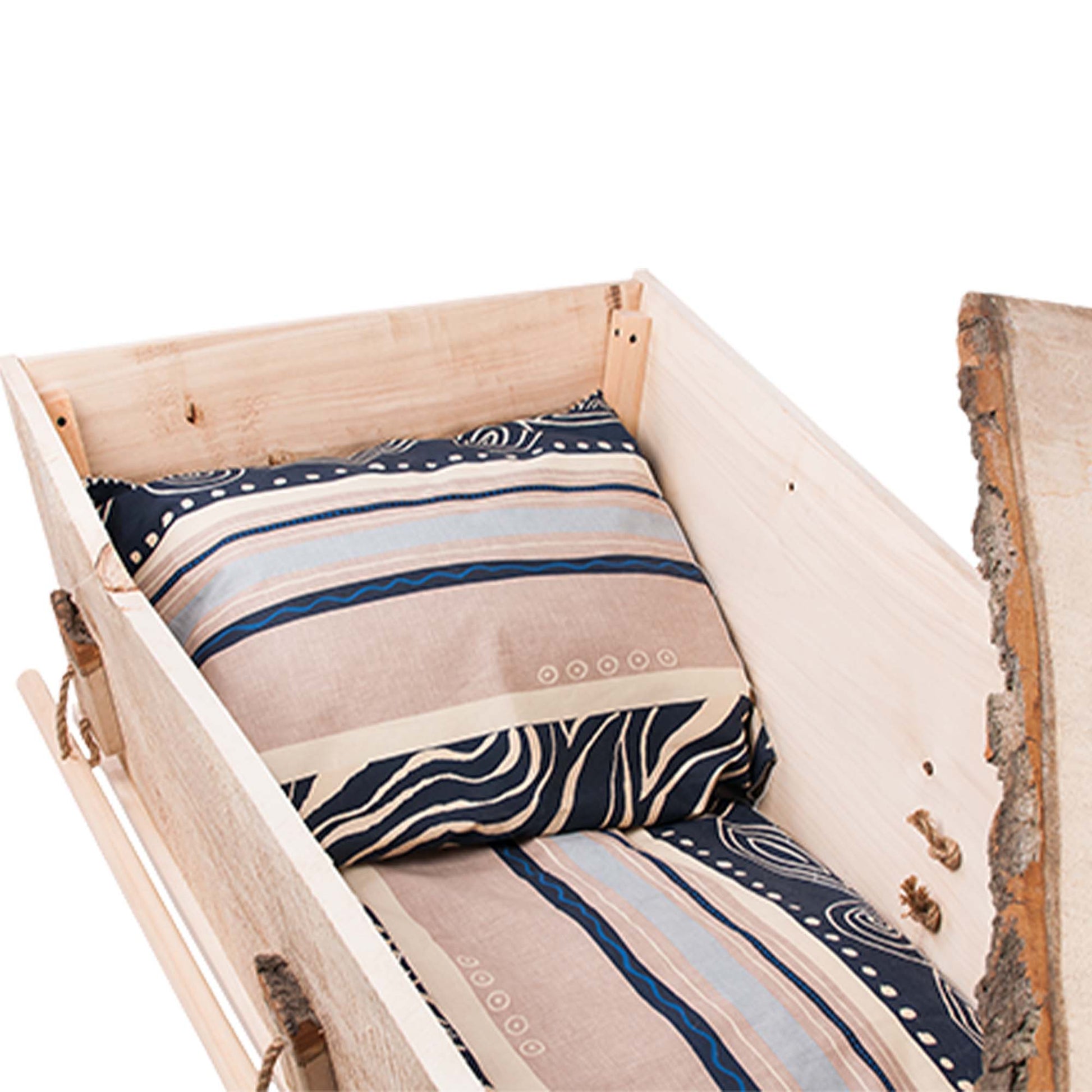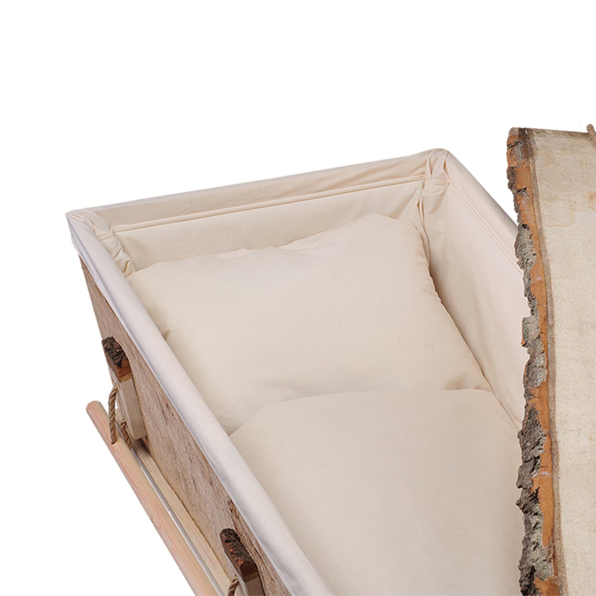 Tussen de hoge bomen en het zachte licht van het bos straalt de uitvaartkist Poplar’s Embrace rust en puurheid uit. Gemaakt van massief populierenhout met een ongekleurde, natuurlijke afwerking, vormt deze kist een eerlijk eerbetoon aan eenvoud en verbondenheid met de natuur. Het zachte interieur, verkrijgbaar in ademend nuvu katoen of strak katoen voor een minimalistische uitstraling, omhult in sereniteit en geeft een gevoel van warmte en geborgenheid.