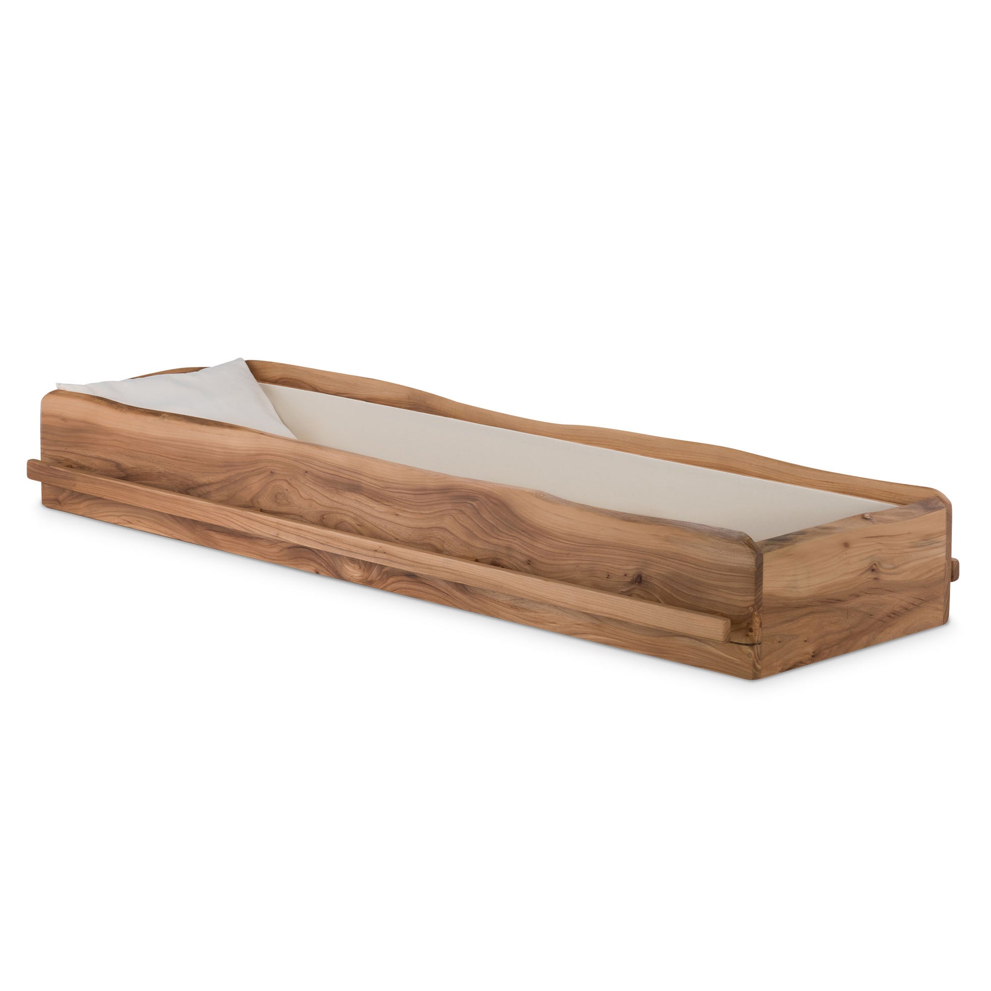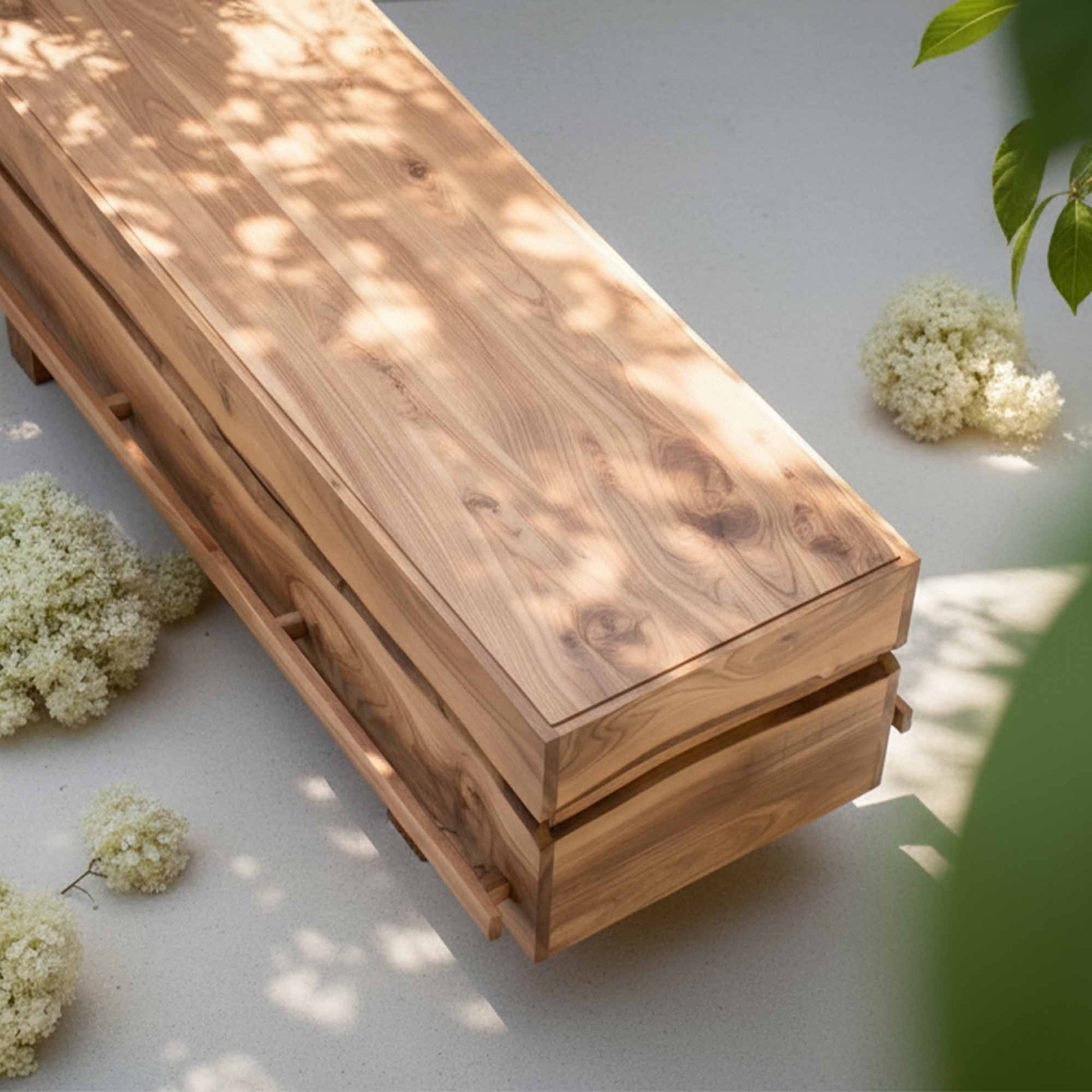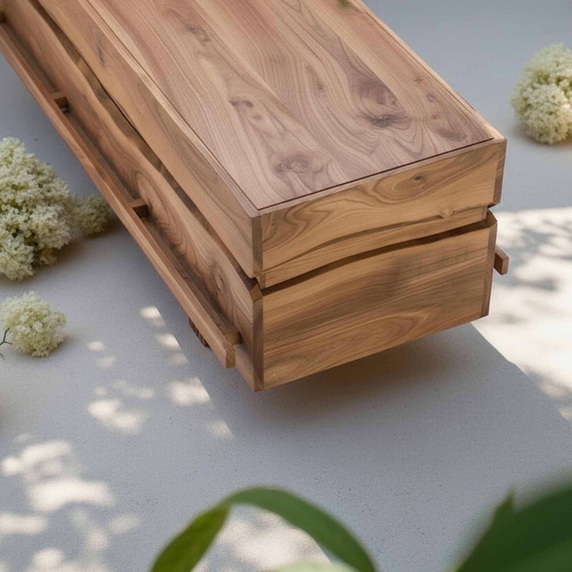 Deze uitvaartkist van massief iepenhout ademt rust en natuurlijke elegantie. De zichtbare houtnerf, natuur gelakte afwerking en lange houten handgreep zorgen voor een eerlijke en evenwichtige uitstraling — ontworpen voor een waardig afscheid in verbondenheid met de natuur.