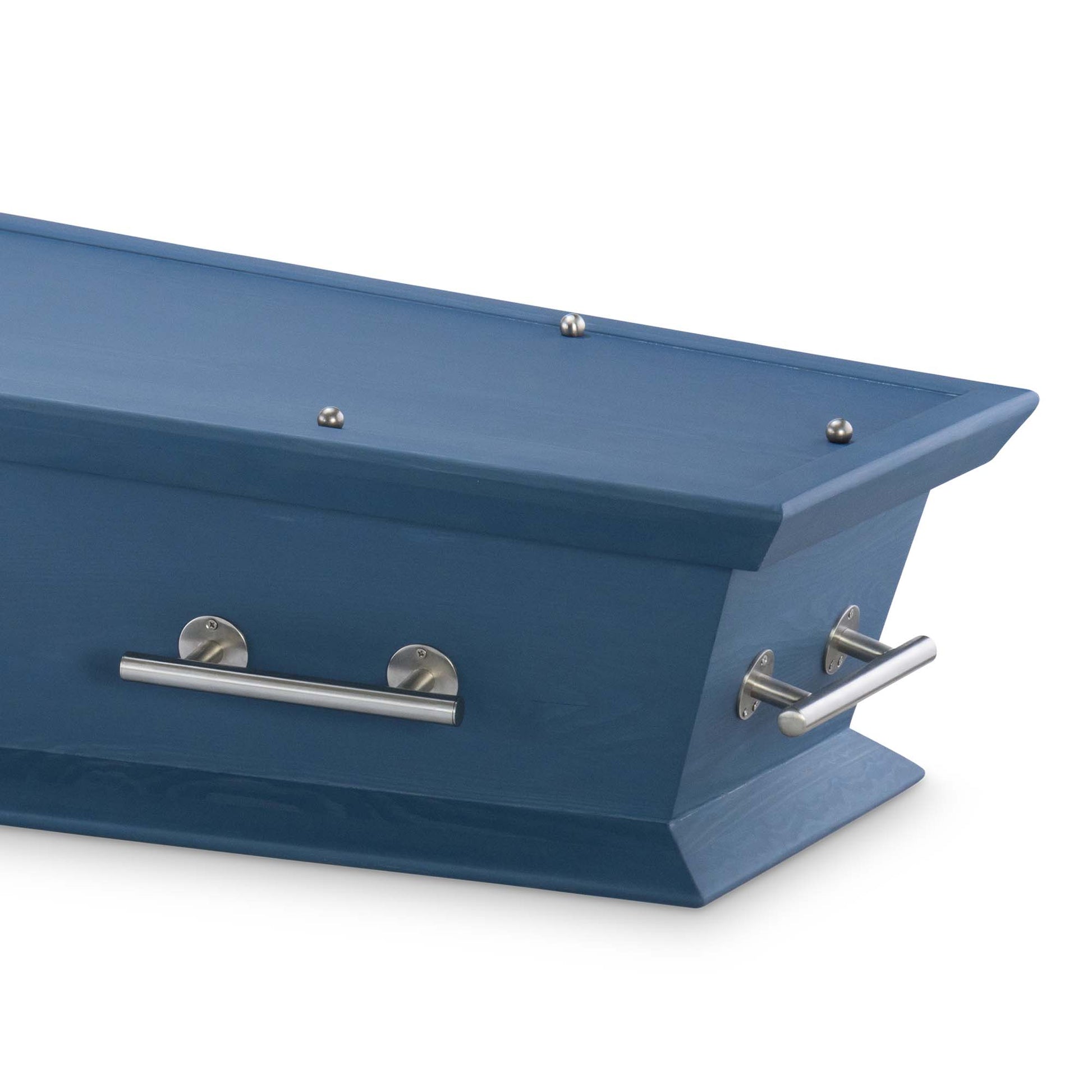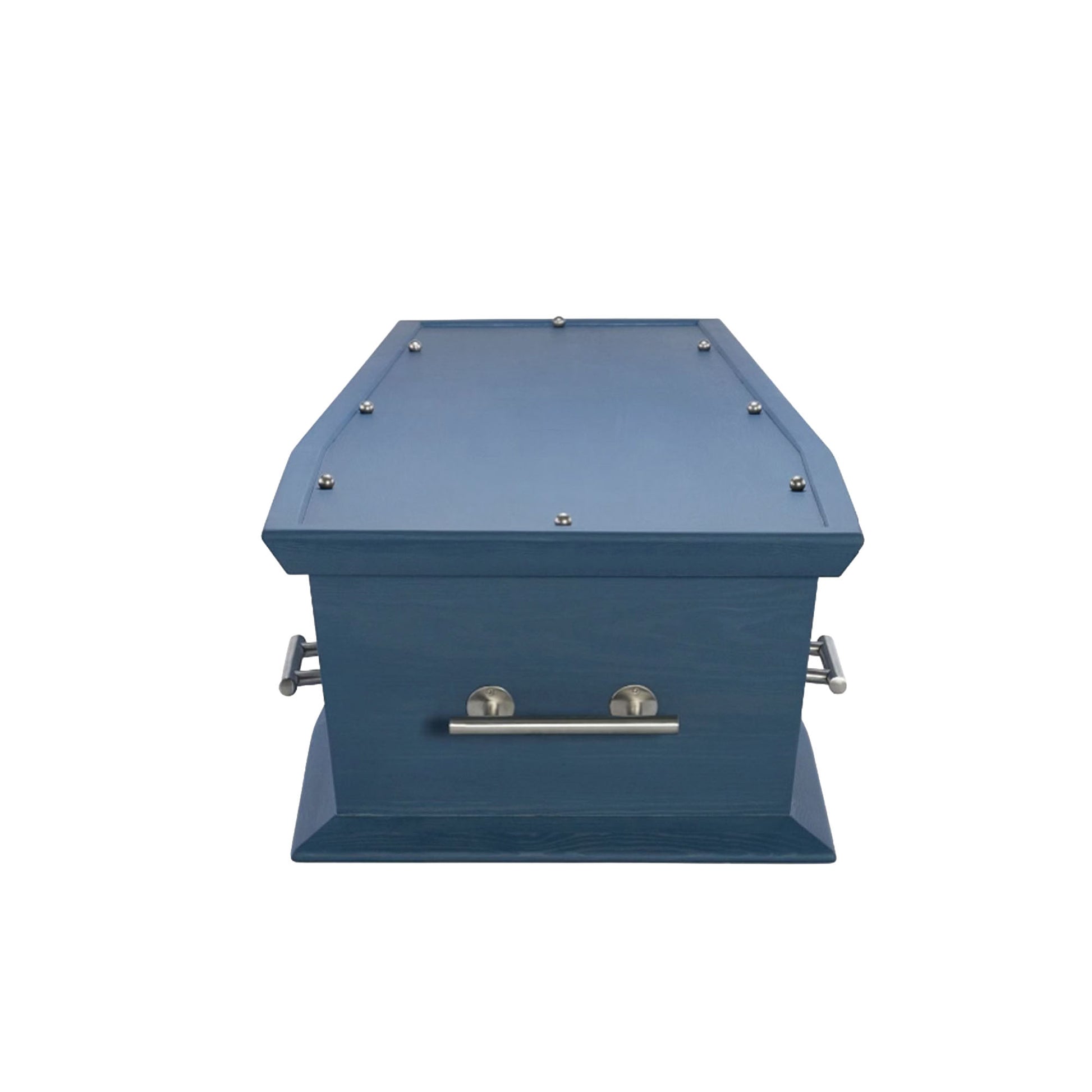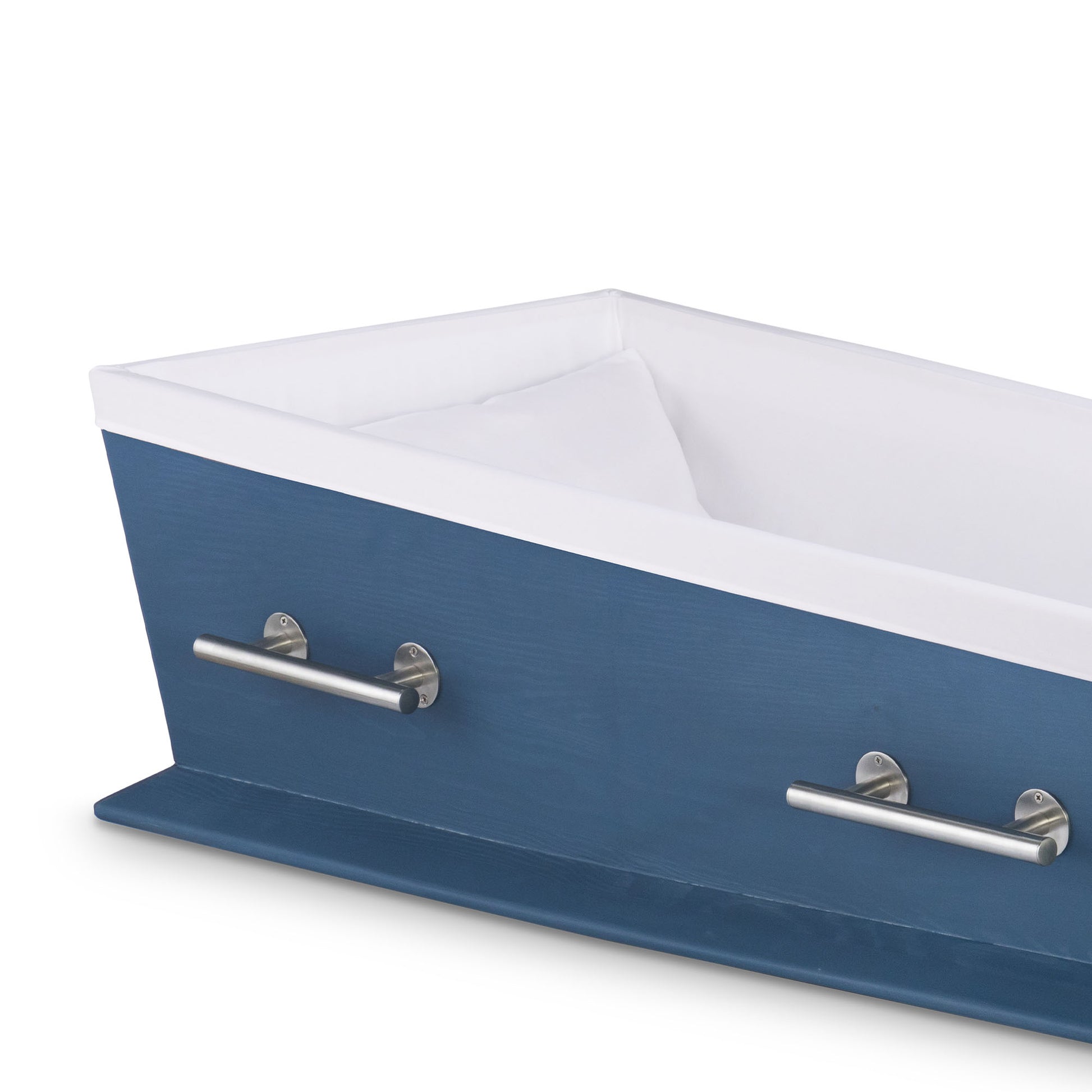 Badend in het zachte licht en omgeven door serene stilte brengt de uitvaartkist Sweet Memory een kalme, troostrijke uitstraling. Vervaardigd uit licht grenenhout en afgewerkt in clematisblauw, laat het ontwerp de natuurlijke houtnerf subtiel spreken. Binnenin biedt strak katoen met een zacht dekentje een geborgen en liefdevolle rustplaats.