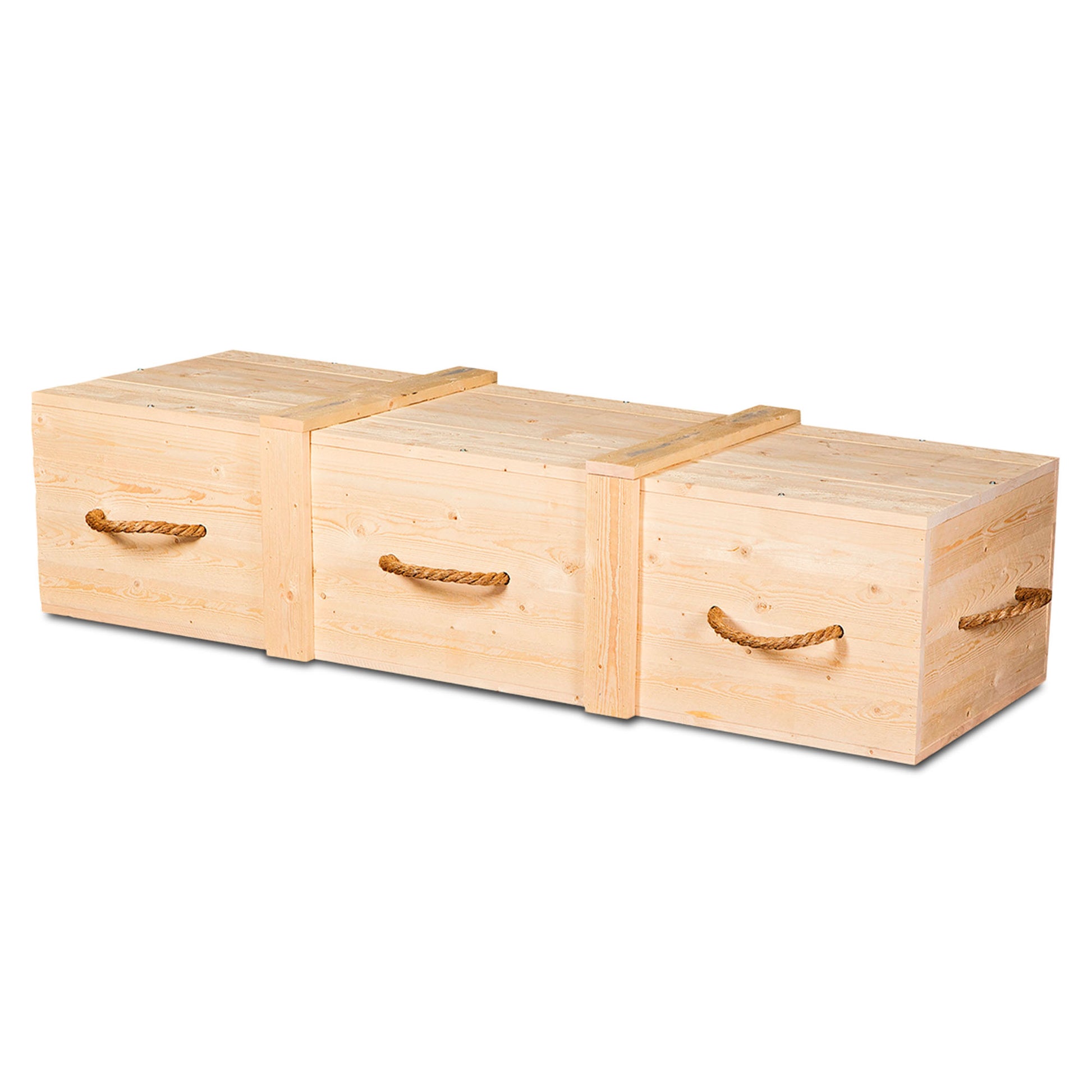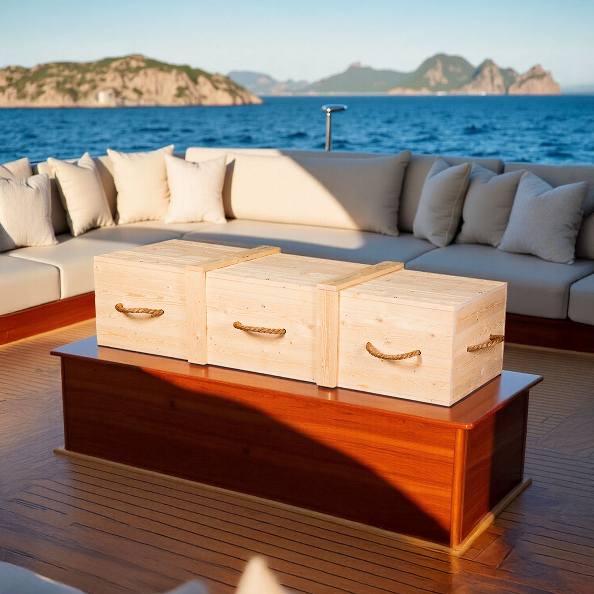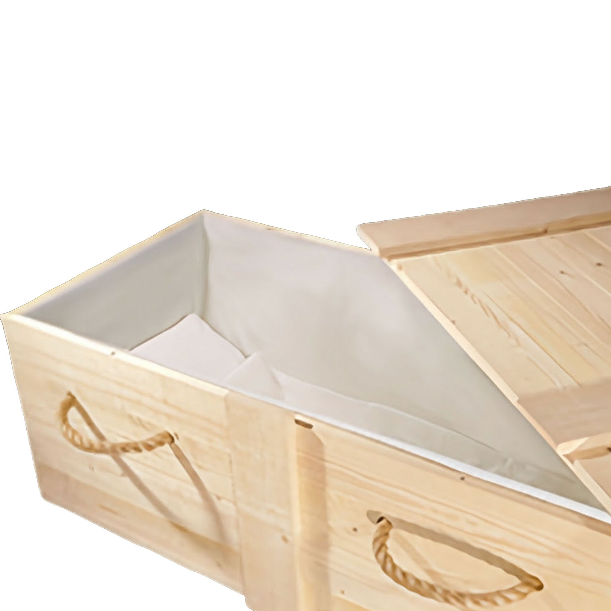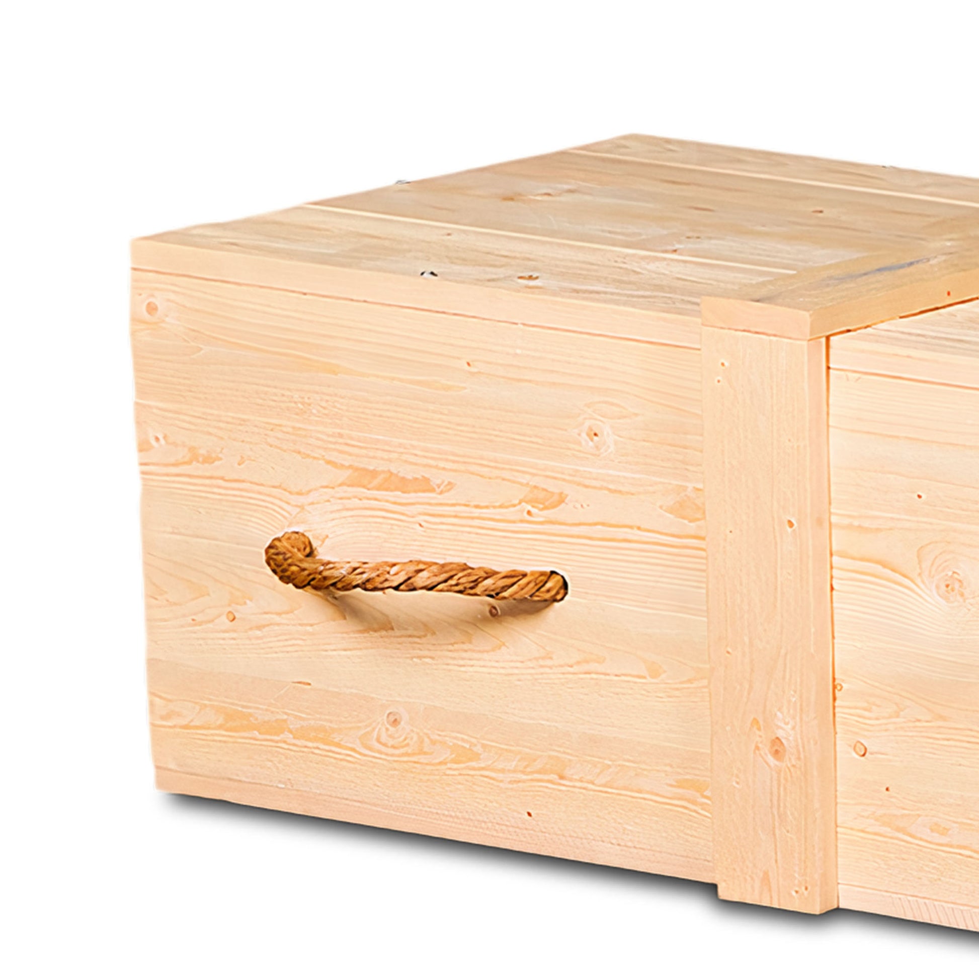 Als een rustpunt op het water straalt deze uitvaartkist eenvoud en verbondenheid uit. Vervaardigd uit puur naaldhout met ongelakte afwerking, robuuste touw grepen en verzonken details die doen denken aan scheepvaart. Het katoenen interieur biedt een zachte, troostrijke rustplaats, puur, natuurlijk en respectvol.