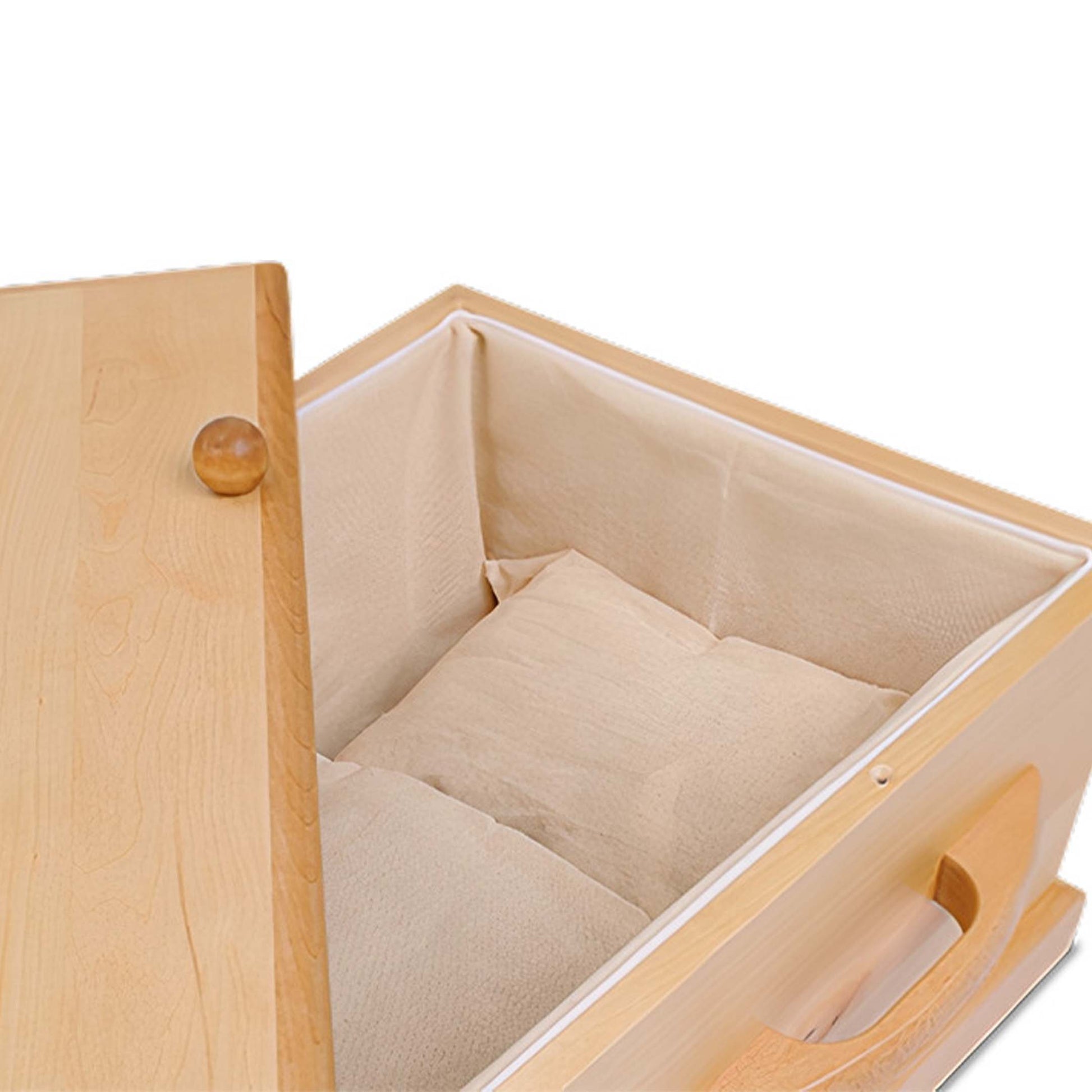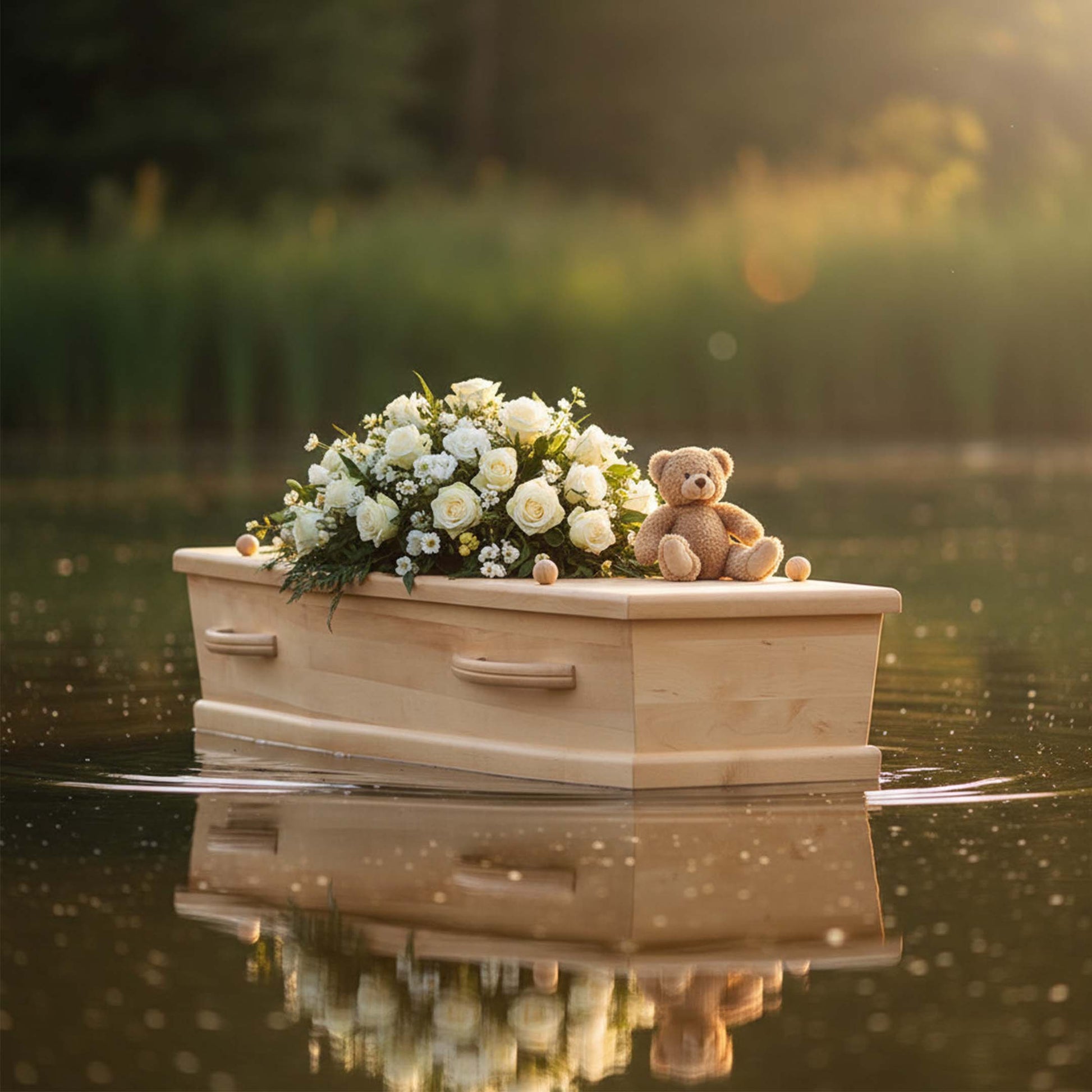 Op het water, omringd door bloemen en zacht licht, wordt het Angels Touch uitvaartkistje een symbool van liefde en rust. Het straalt zachtheid en geborgenheid uit. Vervaardigd uit spaanplaat, weerspiegelt het de puurheid van een kort, maar kostbaar leven. De binnenzijde is bekleed met zacht katoen, een warme, veilige plek voor een liefdevol afscheid. Een klein kistje, groot in betekenis.