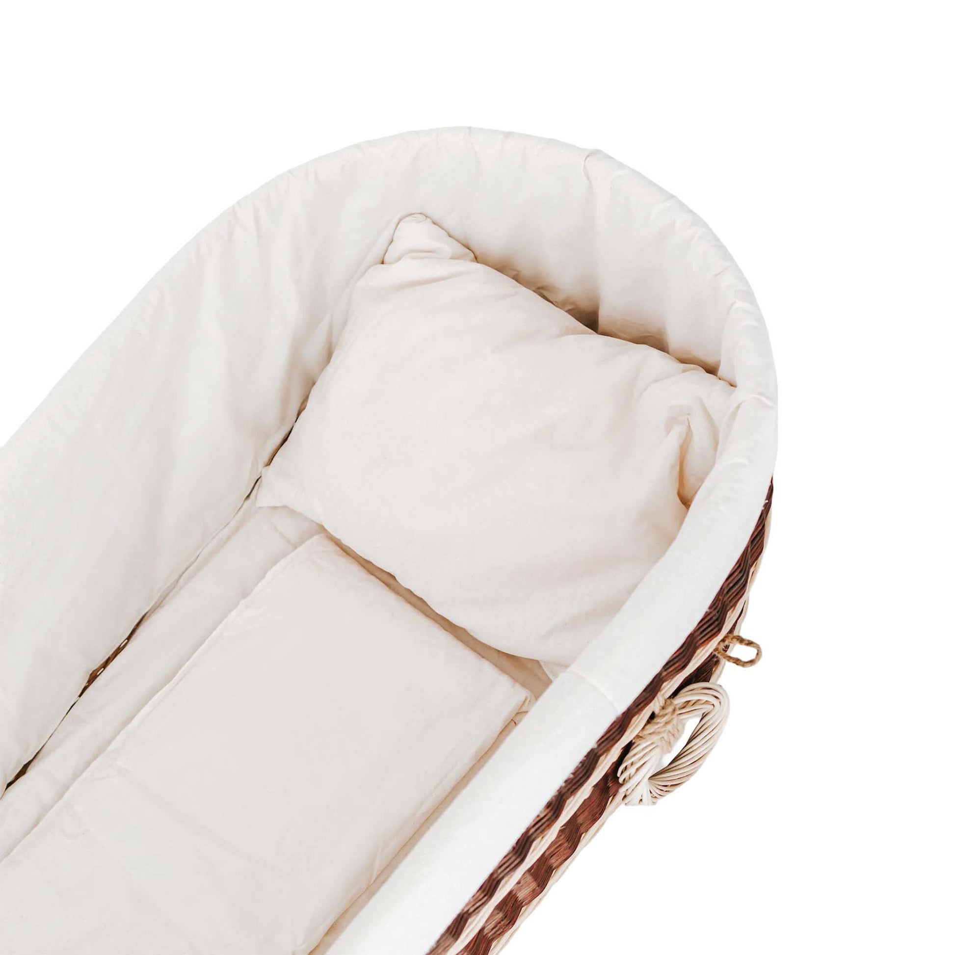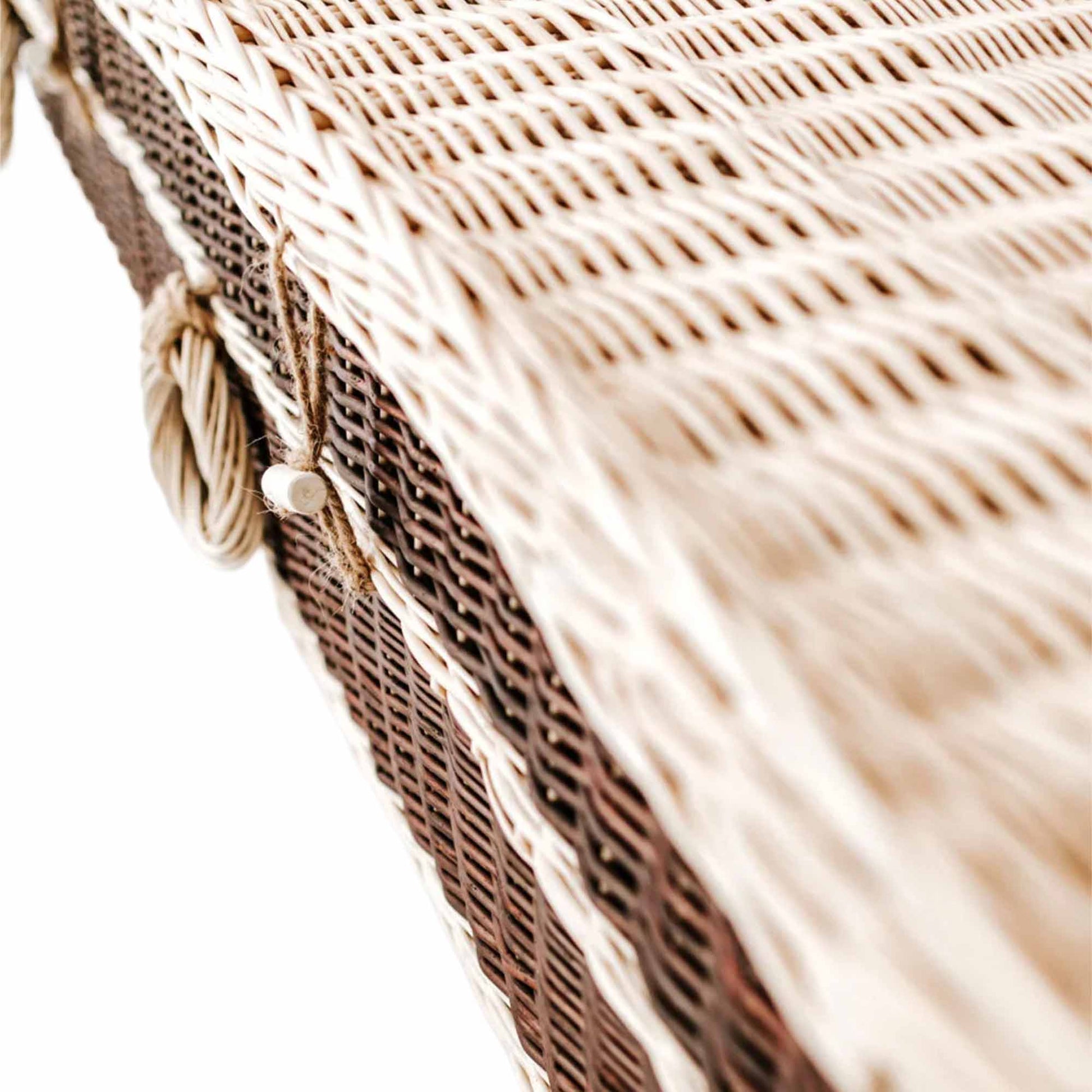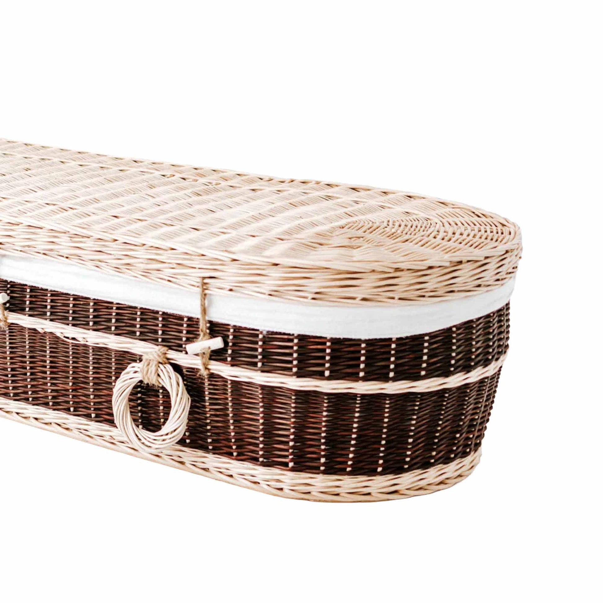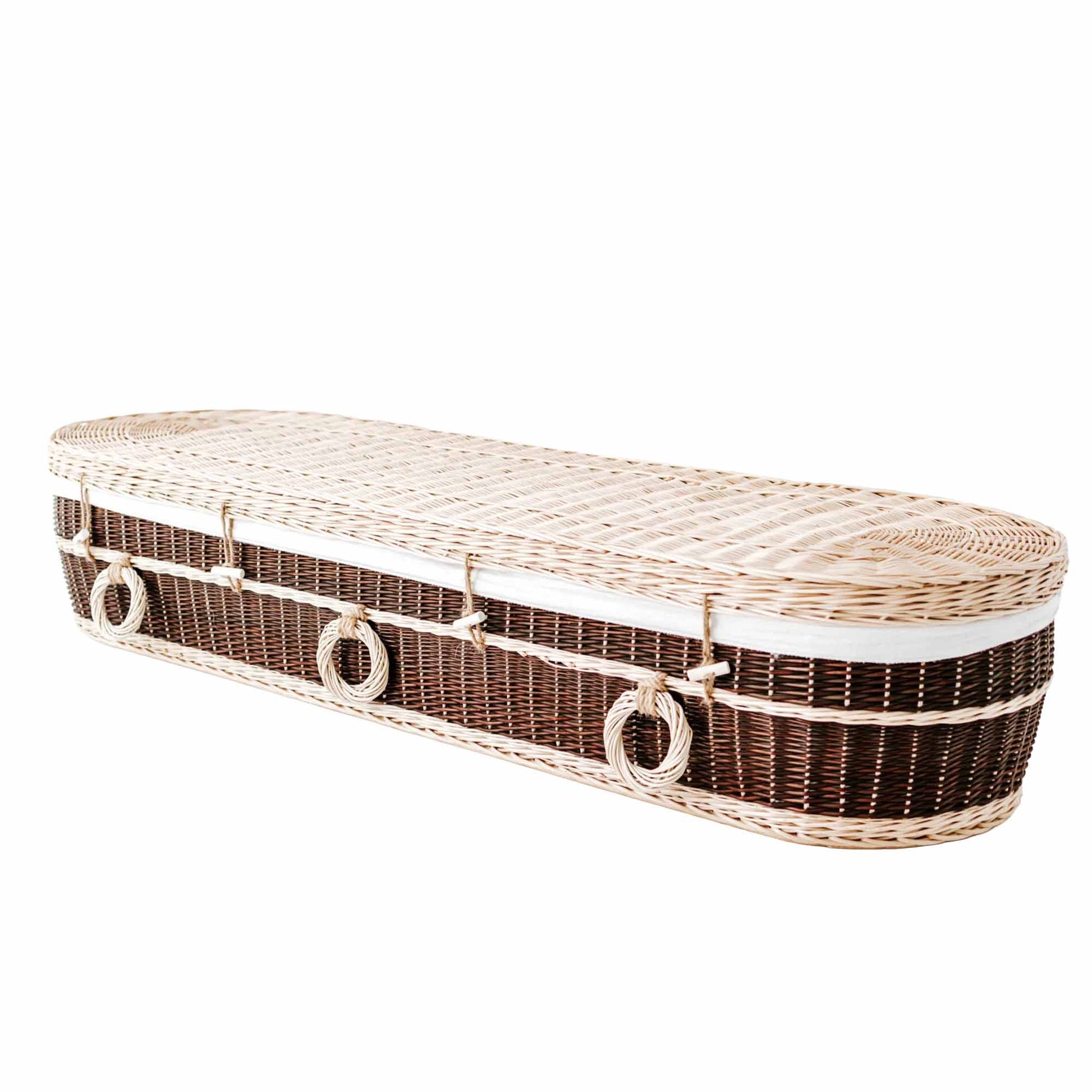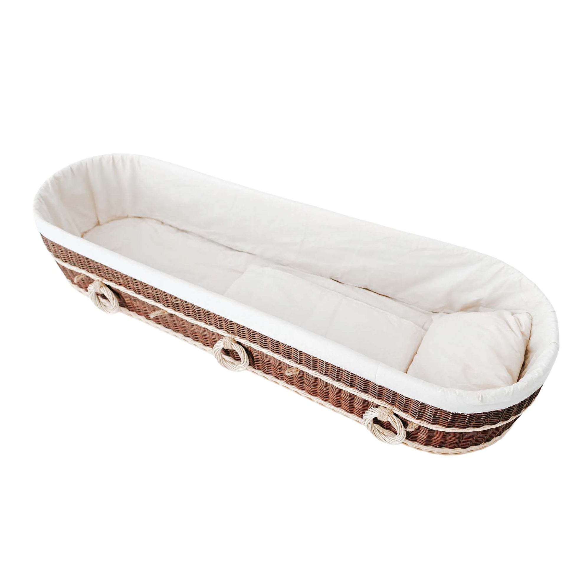 Met uitzicht op wuivende palmen en een serene, zen setting ademt de uitvaartmand Ocean’s Embrace rust en verfijning. Hand gevlochten van wilgenteen in lichte en donkere natuurtinten, met een interieur van puur katoen, compleet met hoofdkussen en deken. Elegante ringgrepen en verfijnde afwerking voor een stijlvol afscheid in verbondenheid met de zee.