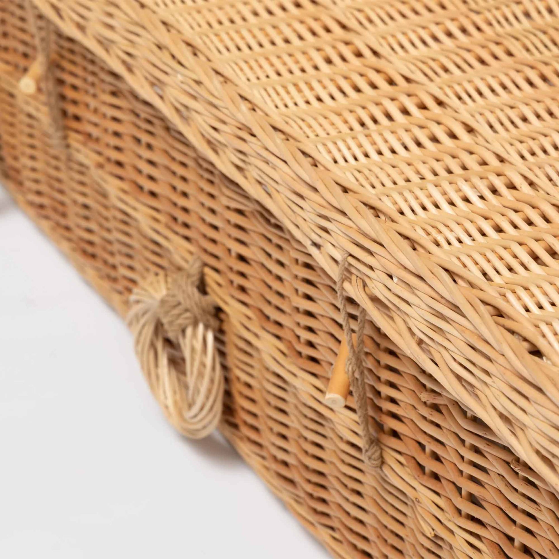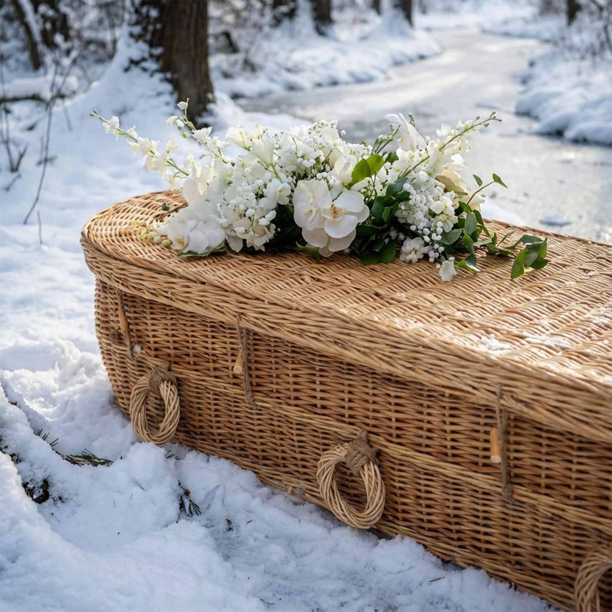omringd door witte bloemen straalt de uitvaartmand Pure Elegance rust, warmte en verfijning uit. Handgevlochten wilgenteen in lichte natuurtinten, met zorg afgewerkt, vormt een stijlvol eerbetoon aan een waardig afscheid. Het zachte katoenen interieur met hoofdkussen en deken biedt geborgenheid, terwijl ringgrepen en subtiele details de tijdloze elegantie benadrukken.