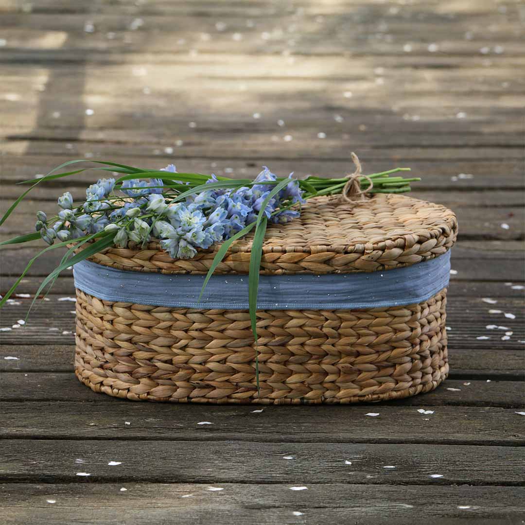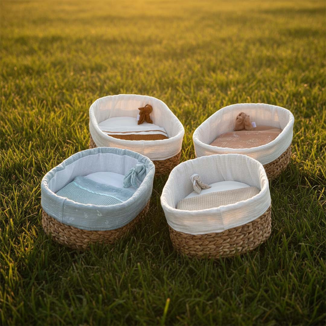 Het ovale mandje is met liefde gemaakt van natuurlijke waterhyacint, een materiaal dat rust, eenvoud en warmte uitstraalt. De hydrofiele binnenrand voelt zacht en puur aan, terwijl het dekentje met rand een teder en verfijnd geheel vormt. Inclusief een klein poppetje van hetzelfde materiaal en een bijpassend kaarsje, symbolen van troost, licht en liefde.