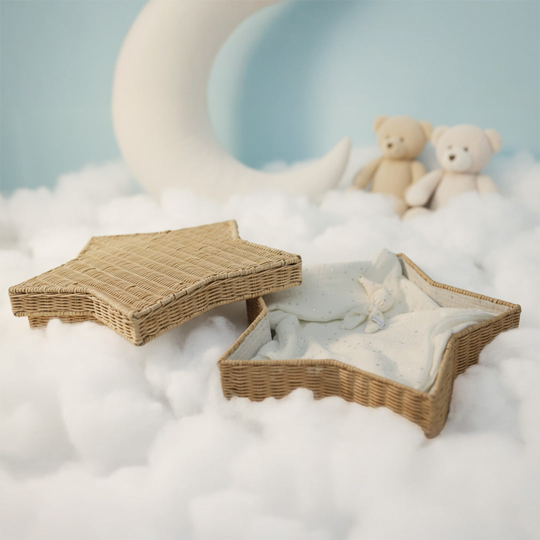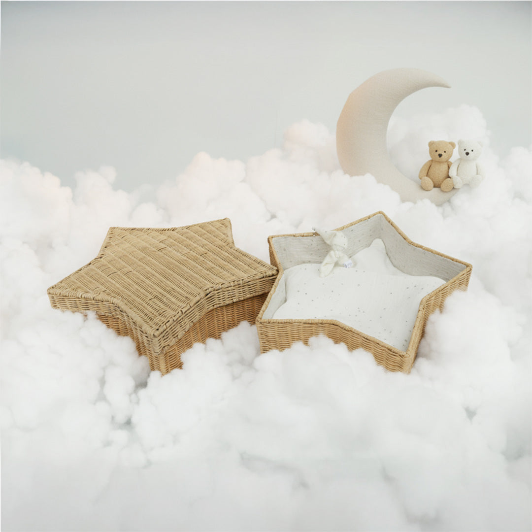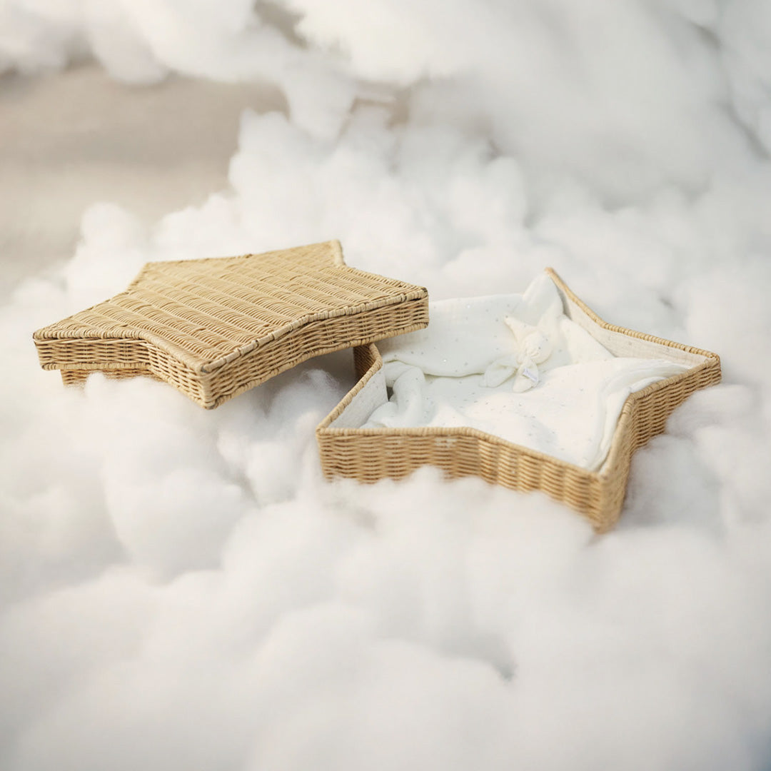 De natuurlijke uitstraling van het vlechtwerk vormt een warme basis, terwijl de ecru hydrofiele binnenbekleding met kleine zilveren sterretjes zorgt voor een teder, dromerig geheel. Inclusief een klein poppetje van hetzelfde materiaal en een bijpassend kaarsje, een liefdevol gebaar van troost en licht. Een mandje dat straalt van liefde, symbool voor een klein sterretje dat voor altijd blijft schijnen.