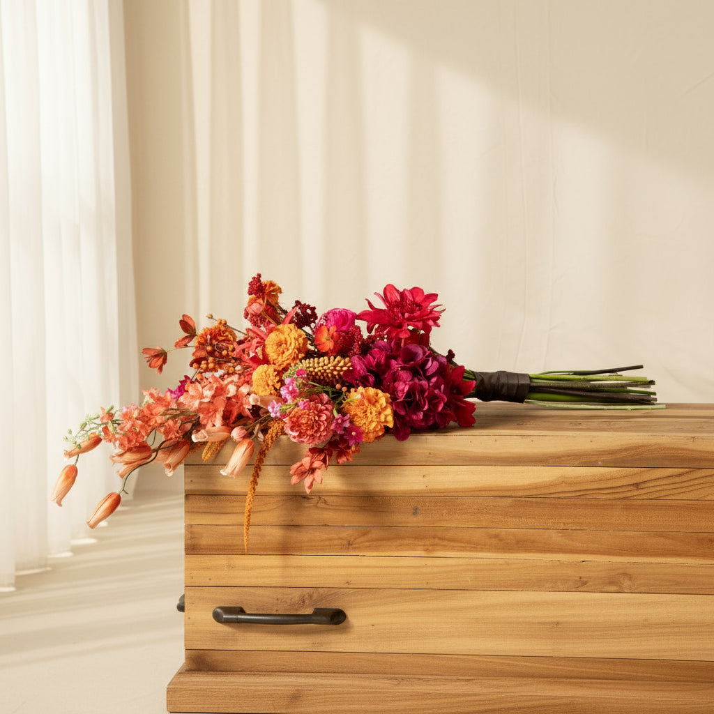 Een stijlvol zijden rouwboeket in warme tinten van bordeaux, oudroze en crème. Handgemaakt met hoogwaardige zijden bloemen als symbool van eeuwige liefde en verbondenheid. Prachtig bij het afscheid en blijvend mooi om thuis neer te zetten als herinnering aan iemand die voor altijd dichtbij blijft. Ieder boeket is uniek en kan licht afwijken van de afbeelding.